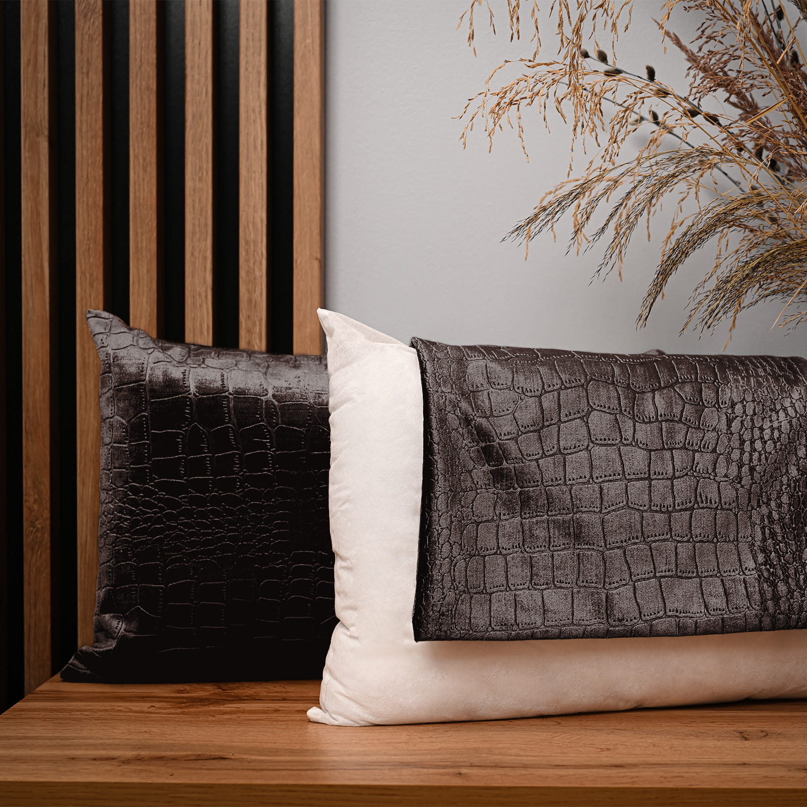 Dekoracyjna poszewka na poduszkę 30x50 cm w kolorze brązowym z tkaniny welurowej z wytłaczanym wzorem “skóra krokodyla”