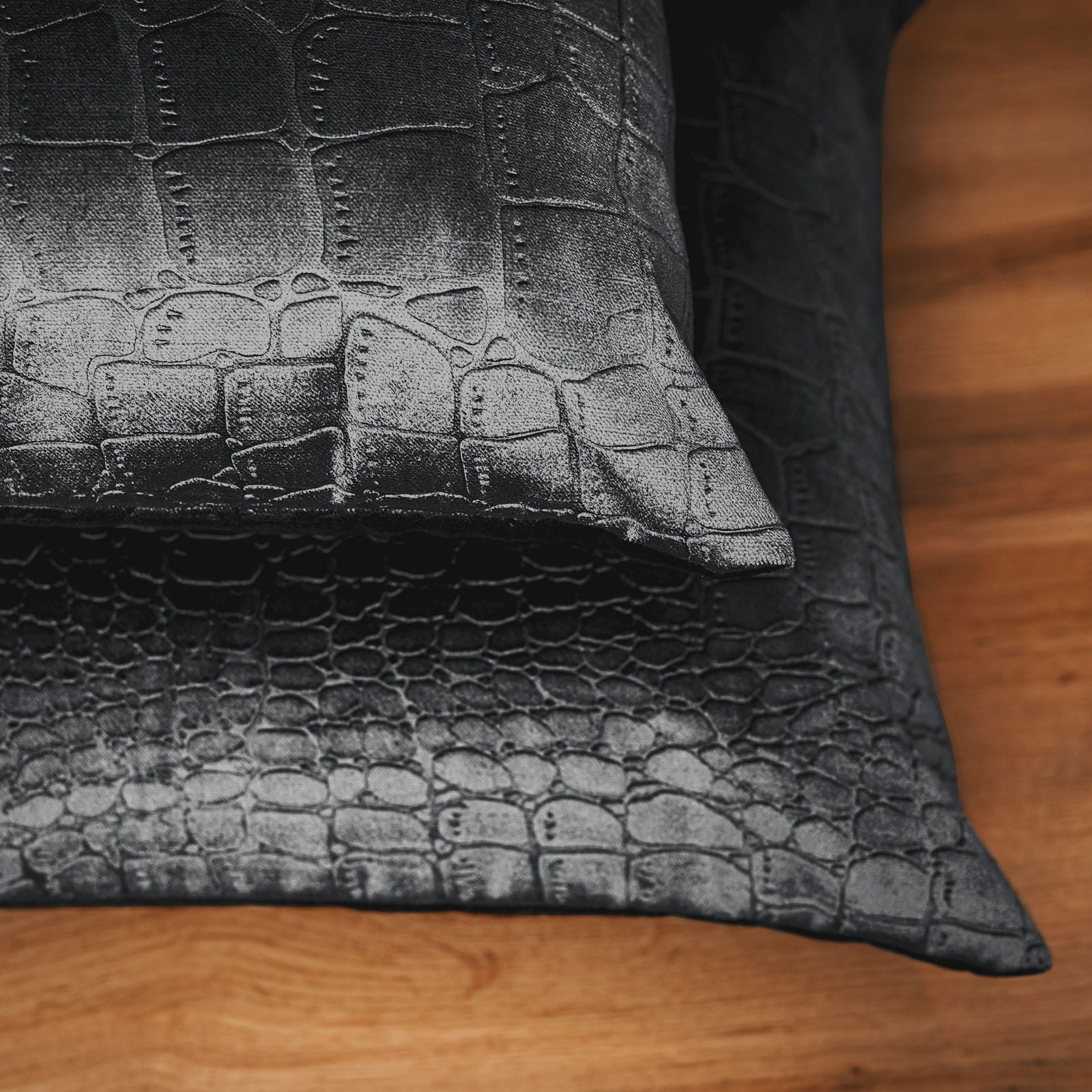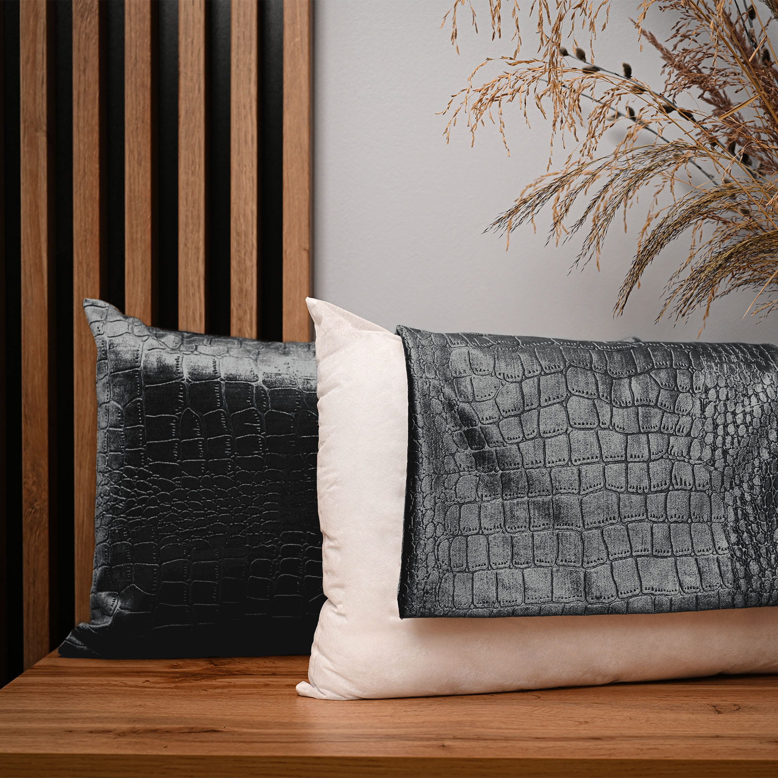 Dekoracyjna poszewka na poduszkę 30x50 cm w kolorze ciemnoszarym z tkaniny welurowej z wytłaczanym wzorem “skóra krokodyla”