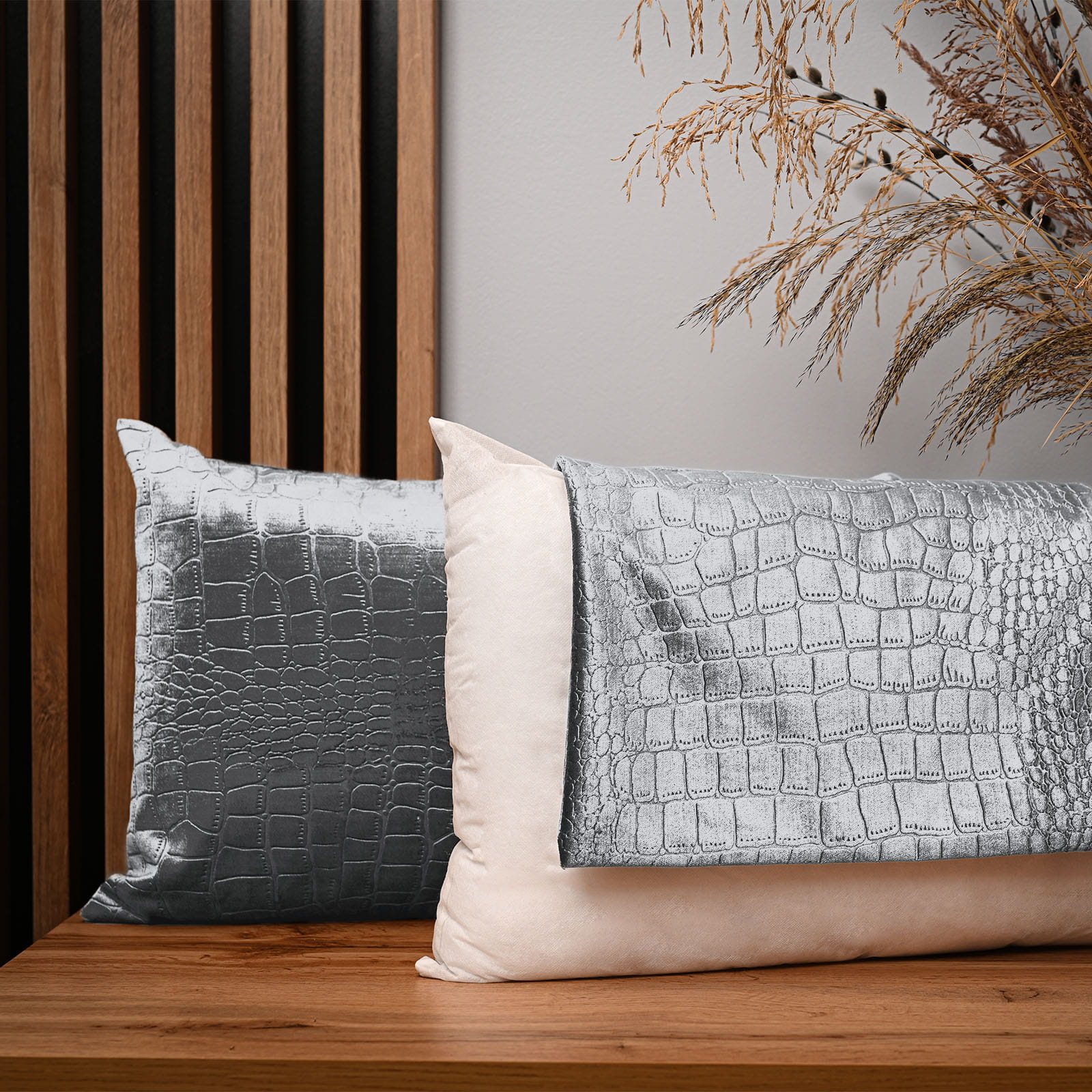 Dekoracyjna poszewka na poduszkę 30x50 cm w kolorze popielatym z tkaniny welurowej z wytłaczanym wzorem “skóra krokodyla”