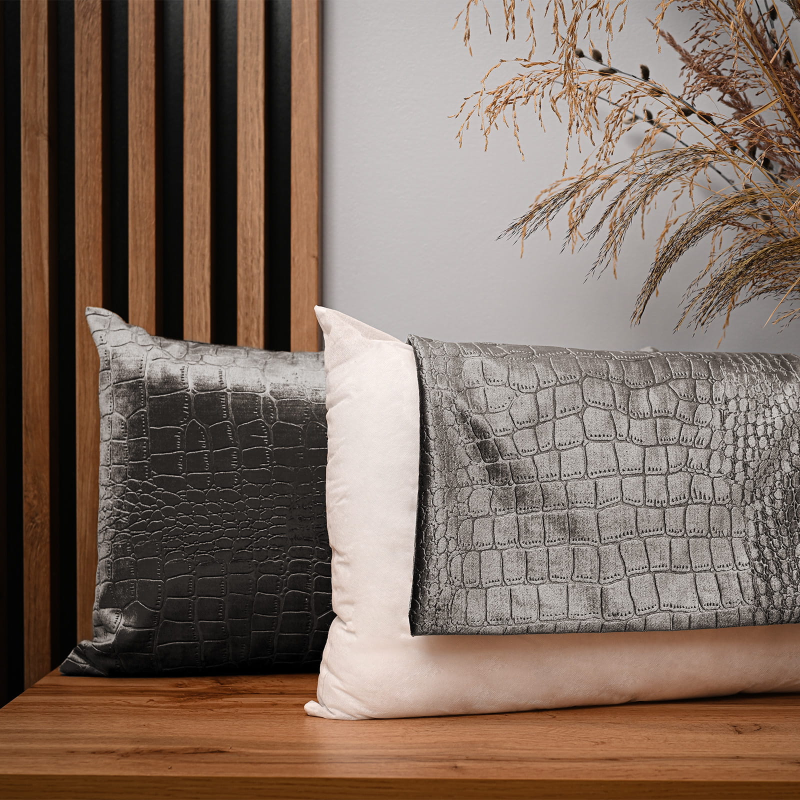Dekoracyjna poszewka na poduszkę 30x50 cm w kolorze szarym z tkaniny welurowej z wytłaczanym wzorem “skóra krokodyla”