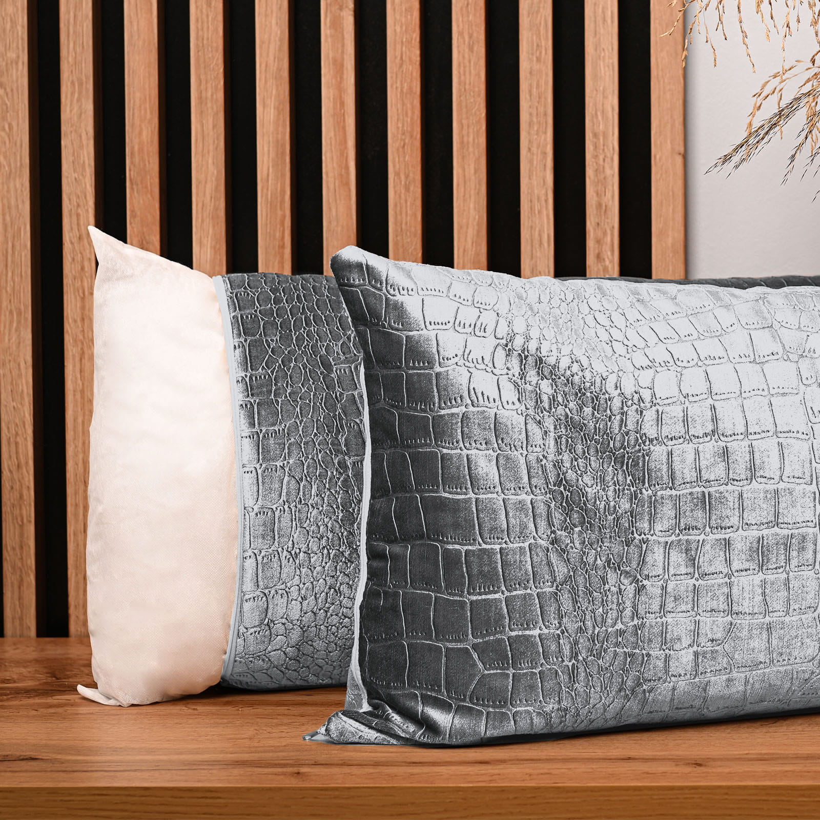 Dekoracyjna poszewka na poduszkę 40x80 cm w kolorze popielatym z tkaniny welurowej z wytłaczanym wzorem “skóra krokodyla”