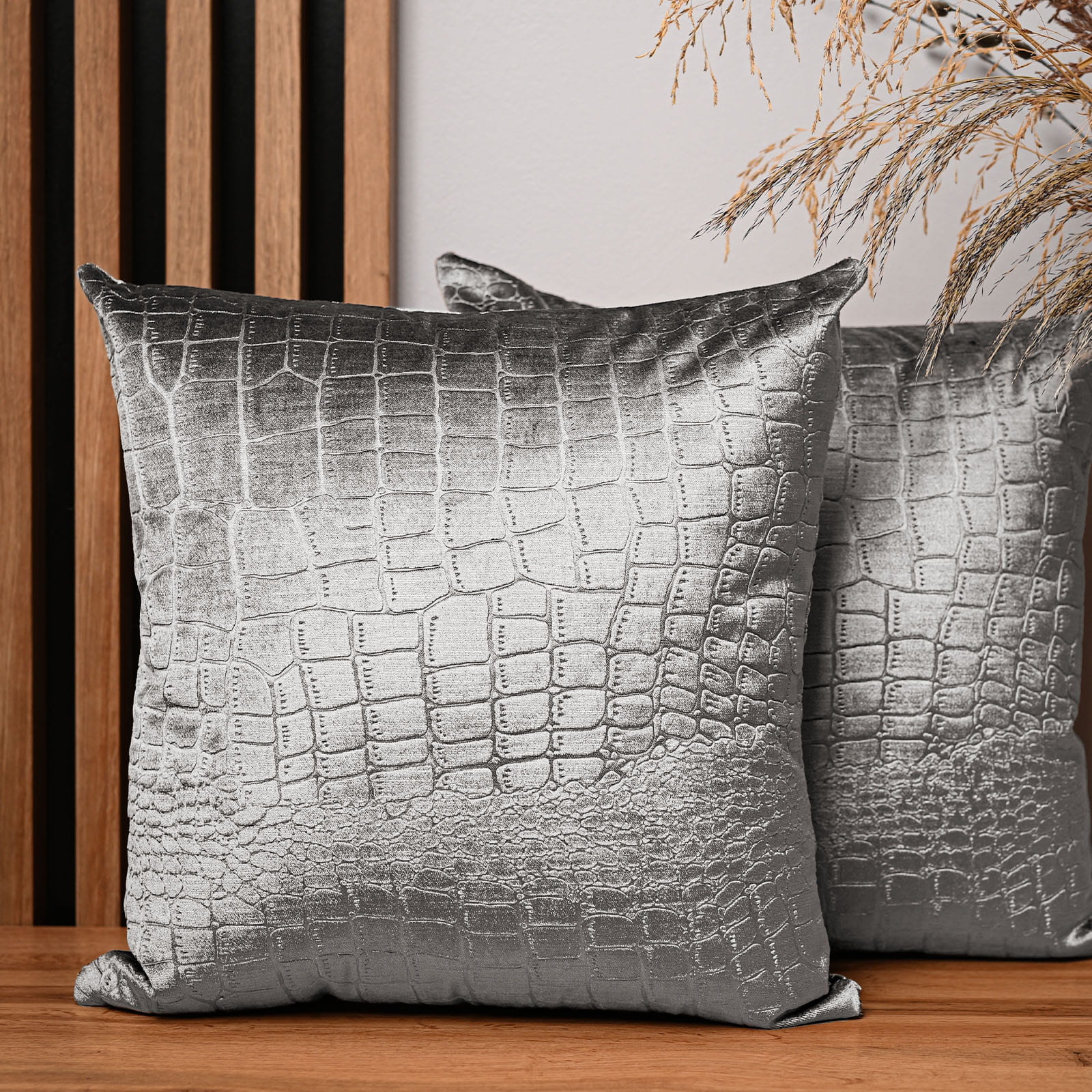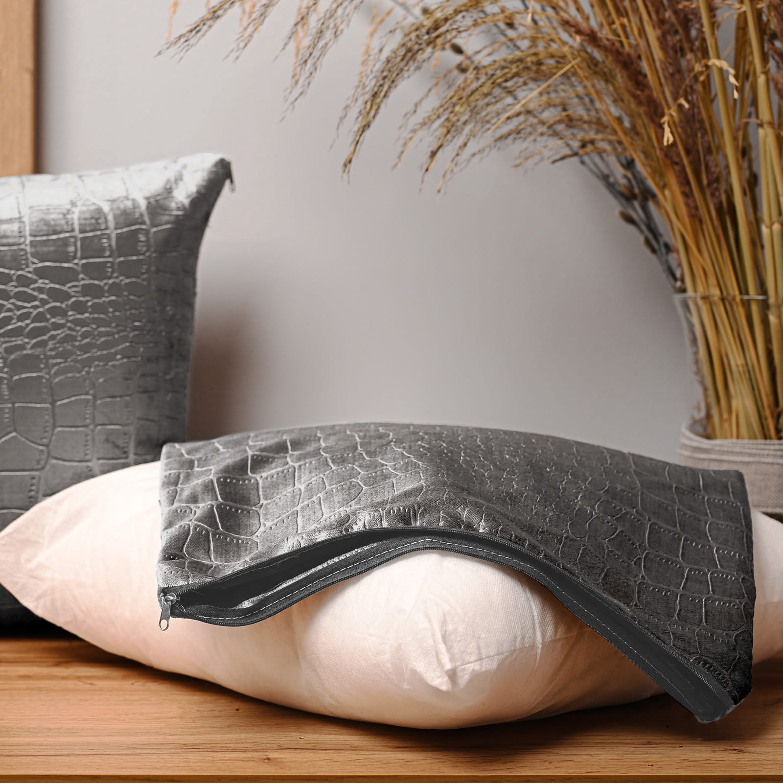 Dekoracyjna poszewka na poduszkę 45x45 cm w kolorze jasnoszarym z tkaniny welurowej z wytłaczanym wzorem “skóra krokodyla”