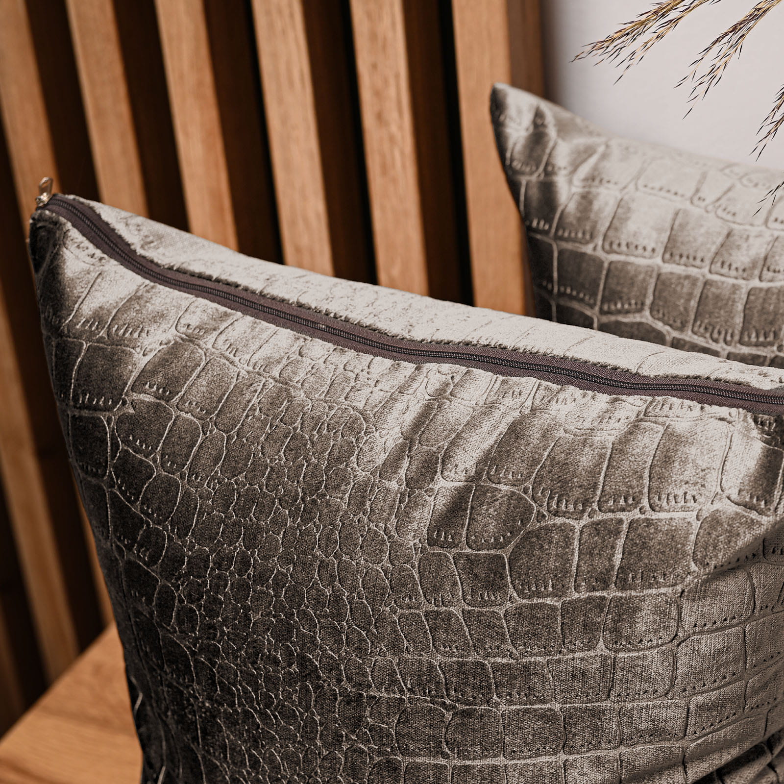 Dekoracyjna poszewka na poduszkę 45x45 cm w kolorze stalowym z tkaniny welurowej z wytłaczanym wzorem “skóra krokodyla”