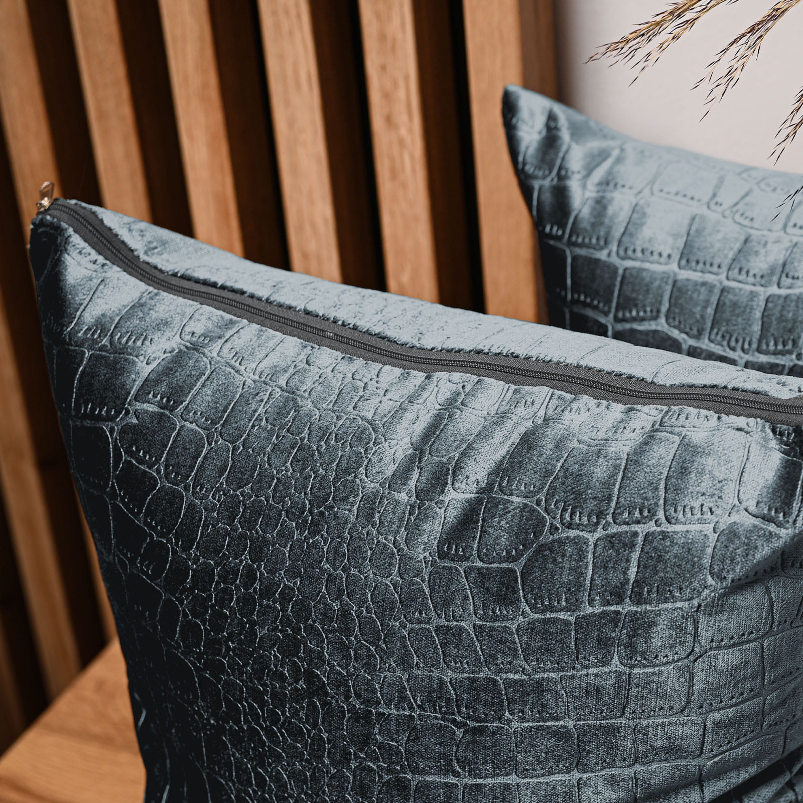 Dekoracyjna poszewka na poduszkę 45x45 cm w kolorze szaroniebieskim z tkaniny welurowej z wytłaczanym wzorem “skóra krokodyla”