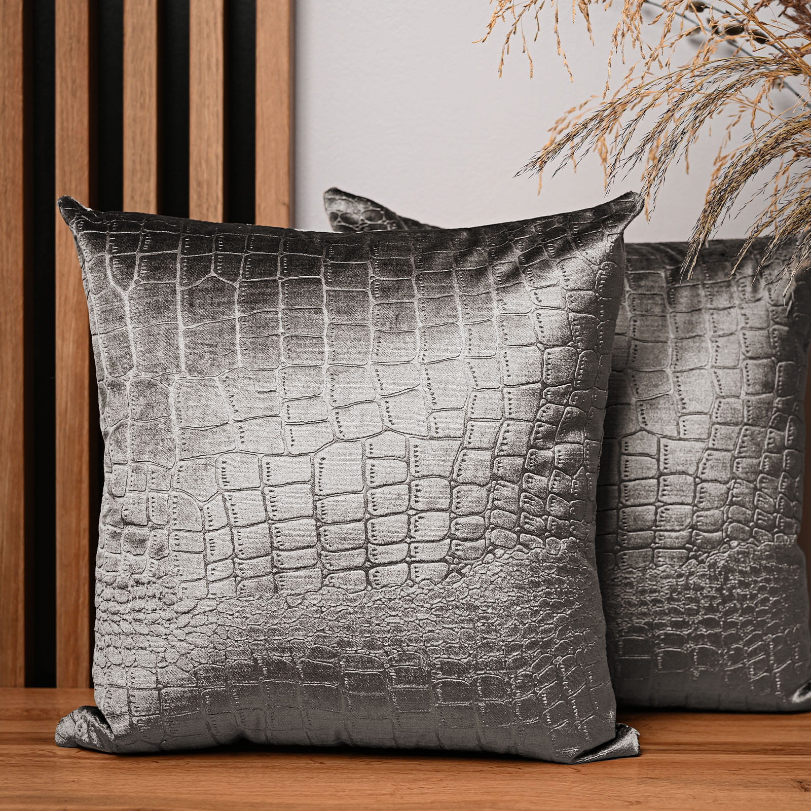 Dekoracyjna poszewka na poduszkę 45x45 cm w kolorze szarym z tkaniny welurowej z wytłaczanym wzorem “skóra krokodyla”
