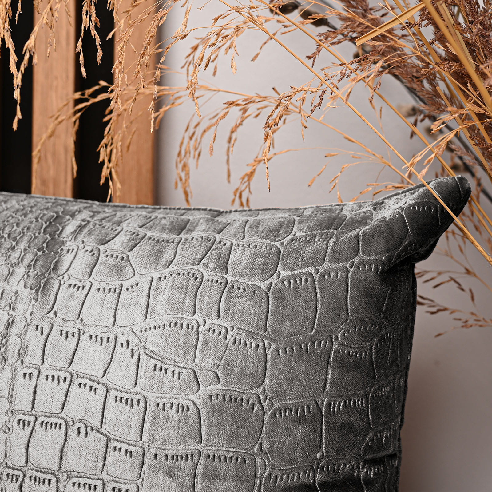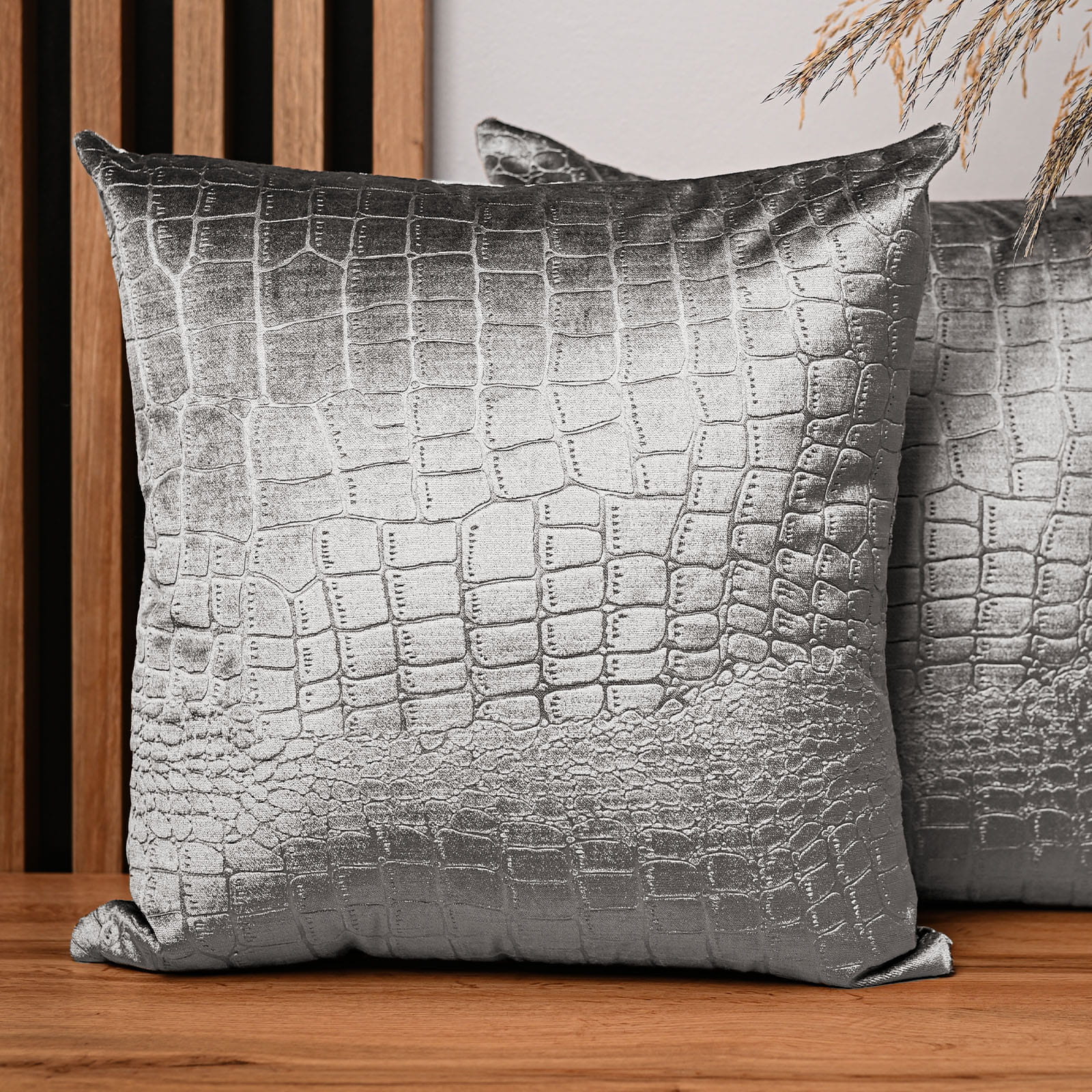 Dekoracyjna poszewka na poduszkę 50x50 cm w kolorze jasnoszarym z tkaniny welurowej z wytłaczanym wzorem “skóra krokodyla”