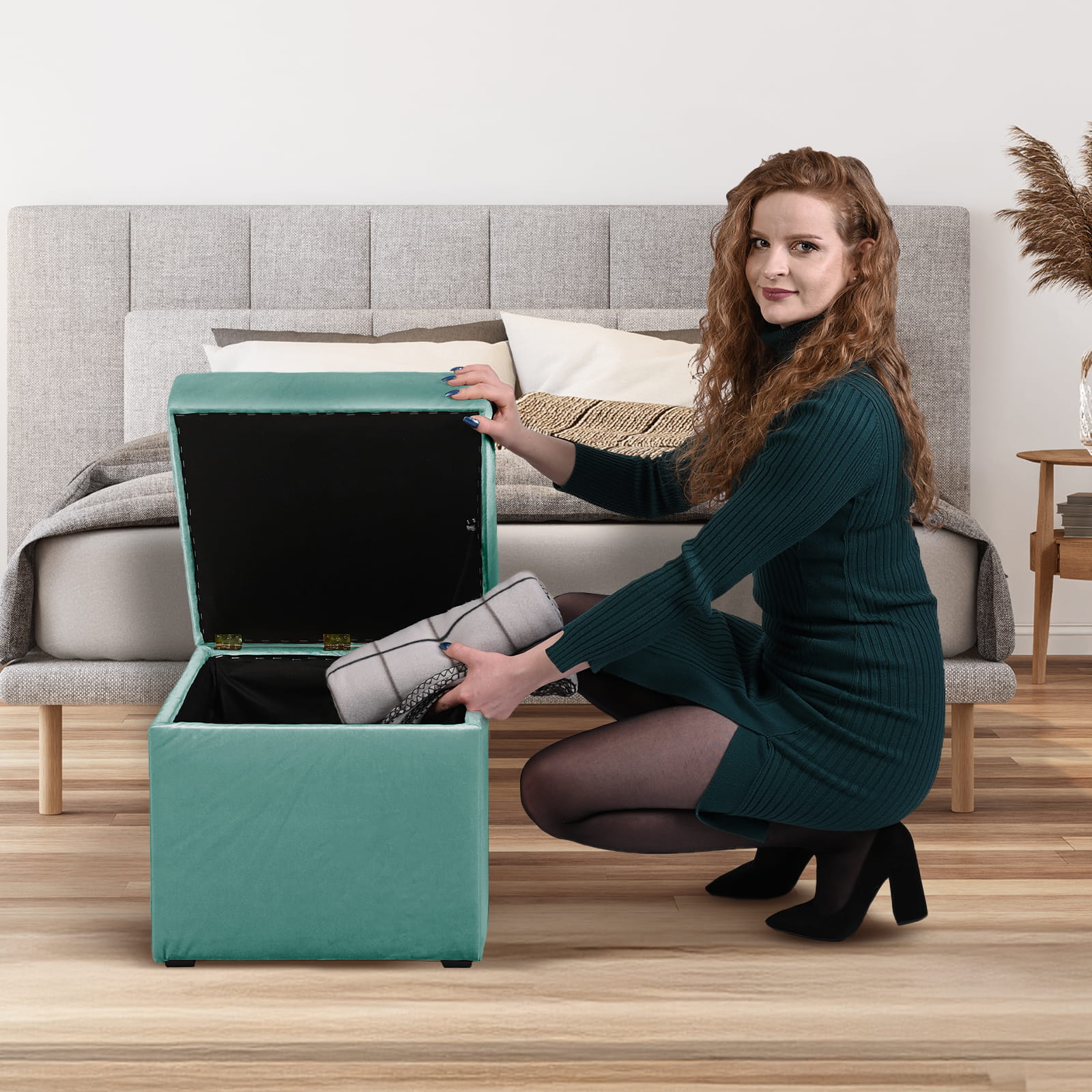 Nowoczesna otwierana pufa 45x45 w kolorze miętowym