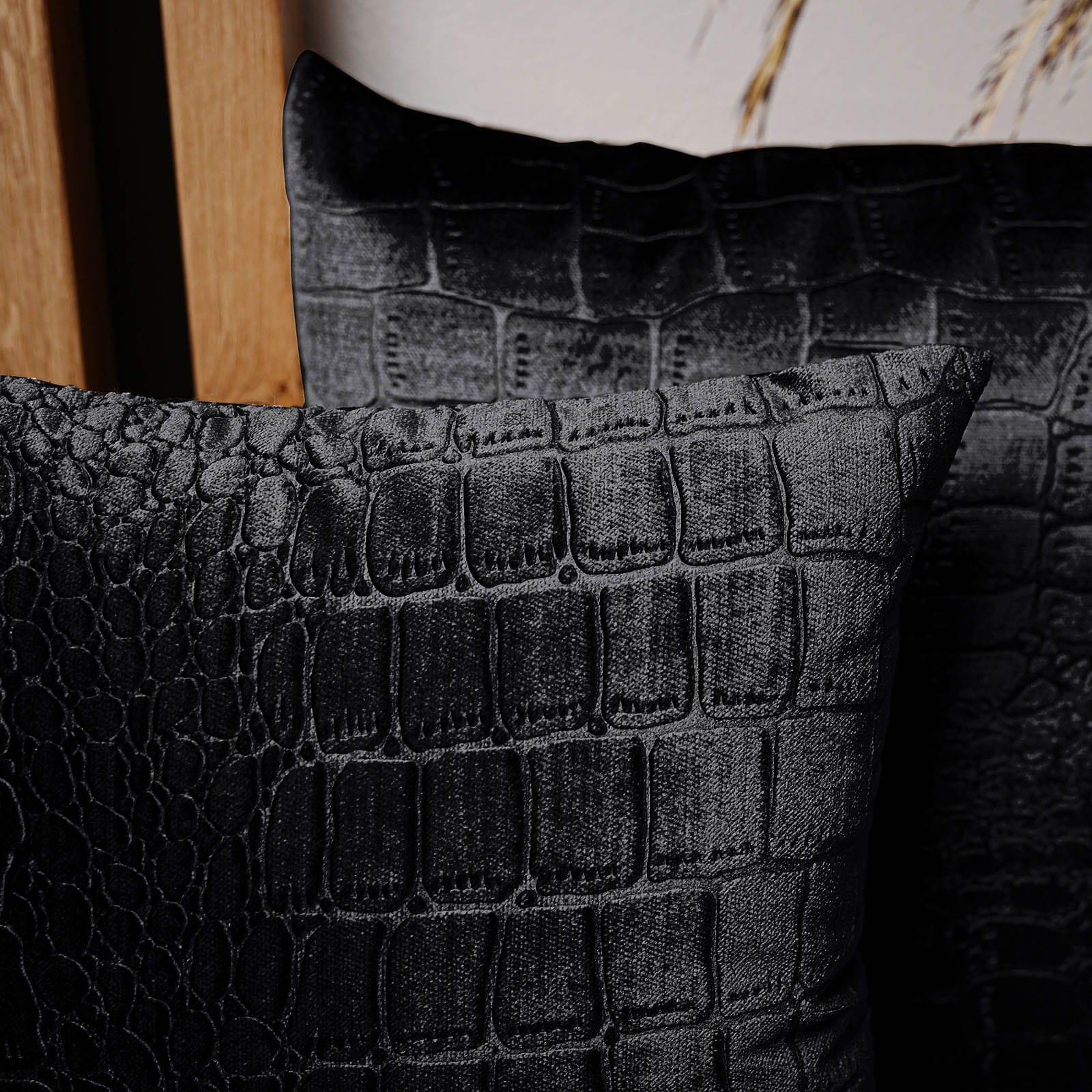 Dekoracyjna poszewka na poduszkę 30x30 cm w kolorze czarnym z tkaniny welurowej z wytłaczanym wzorem “skóra krokodyla”