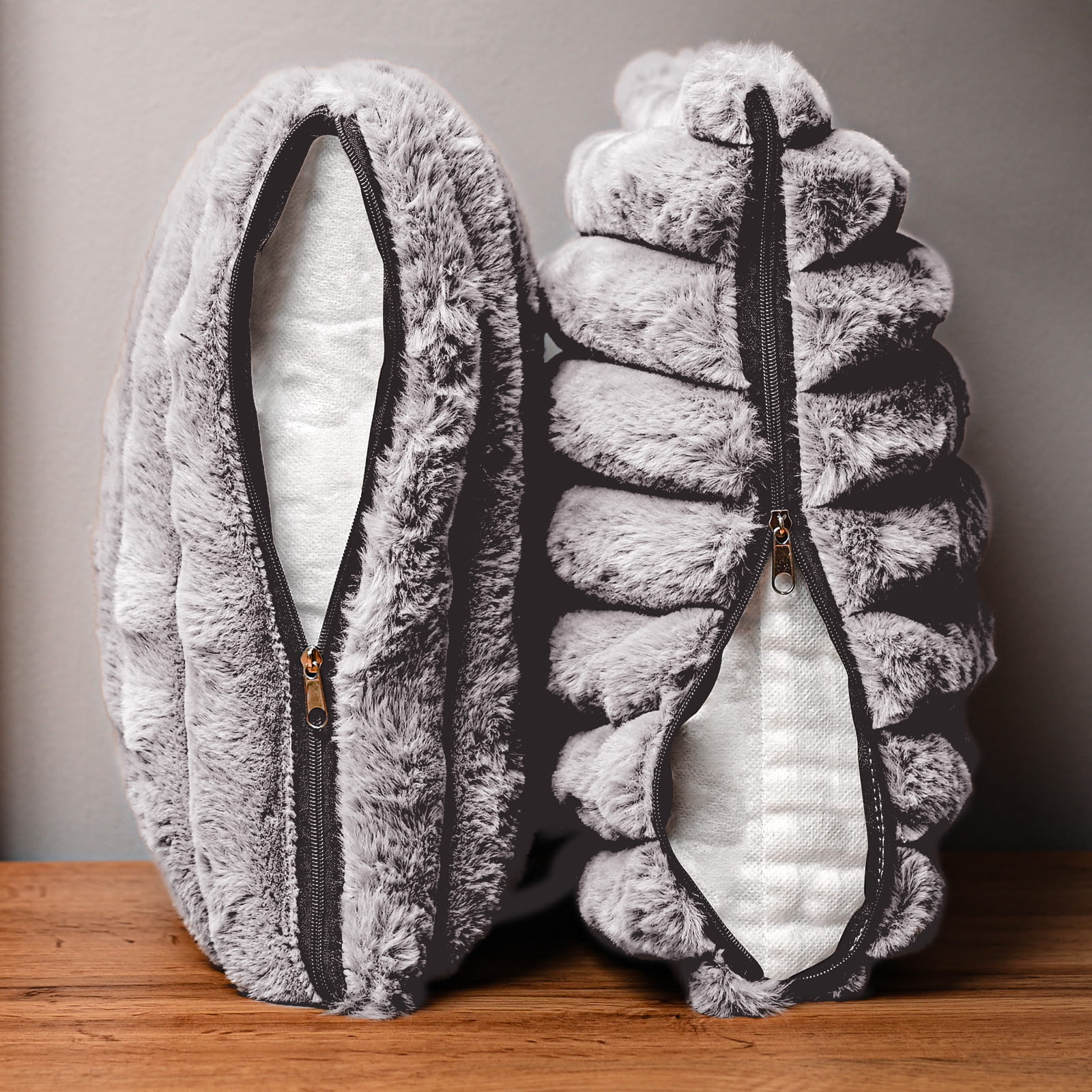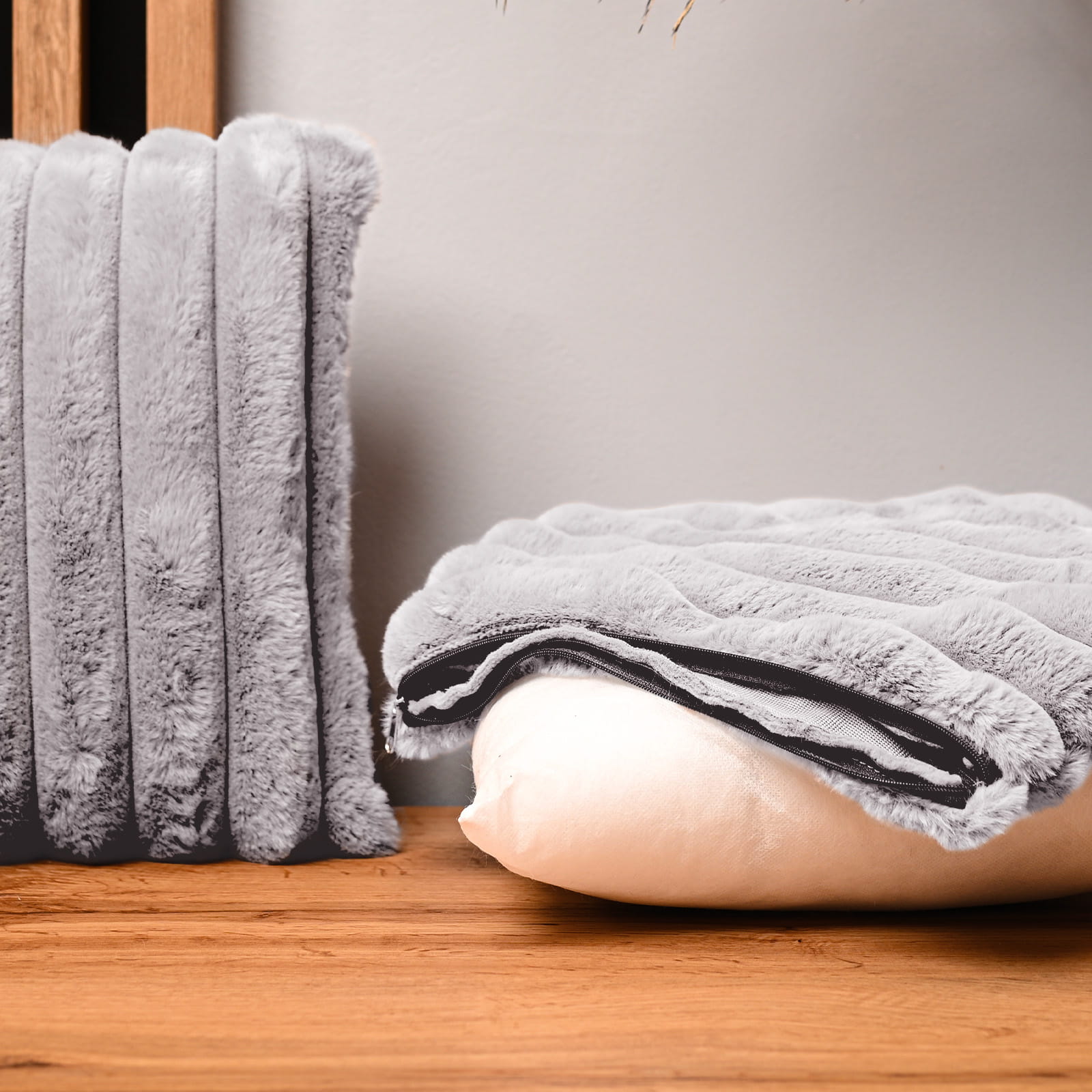 Dekoracyjna poszewka na poduszkę 40x40 cm w kolorze siwym z imitacji futra z przeszyciami