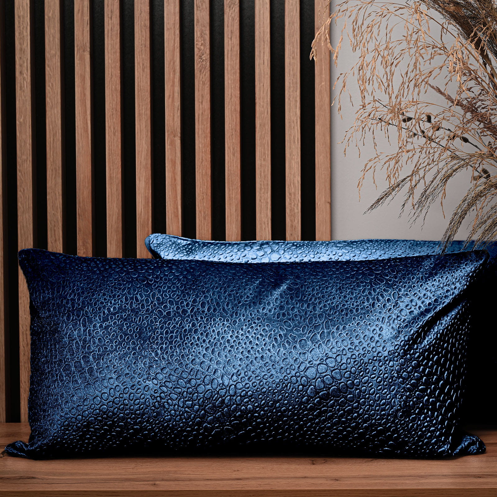 Dekoracyjna poszewka na poduszkę 40x80 cm w kolorze niebieskim z tkaniny welurowej z teksturą “kropelki”