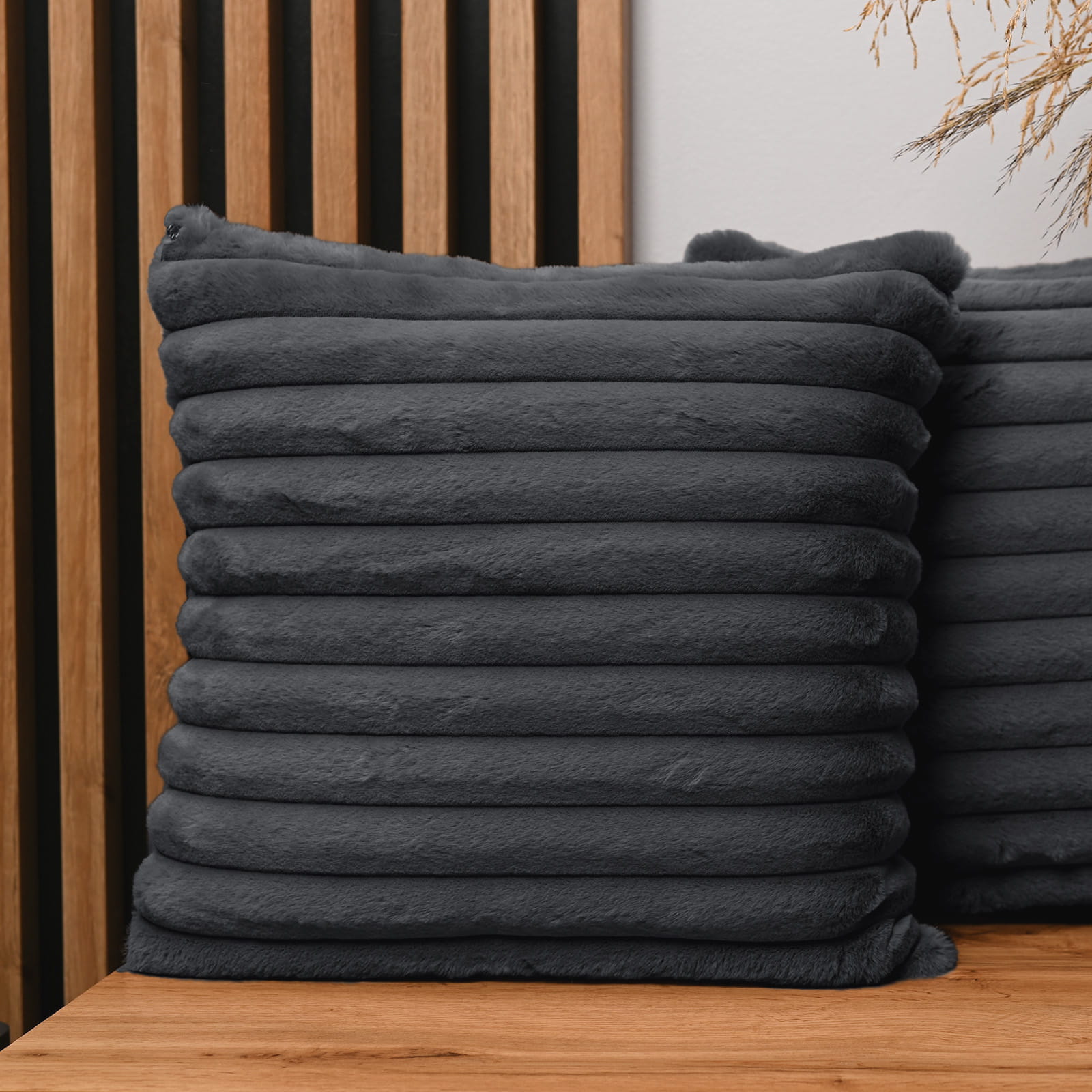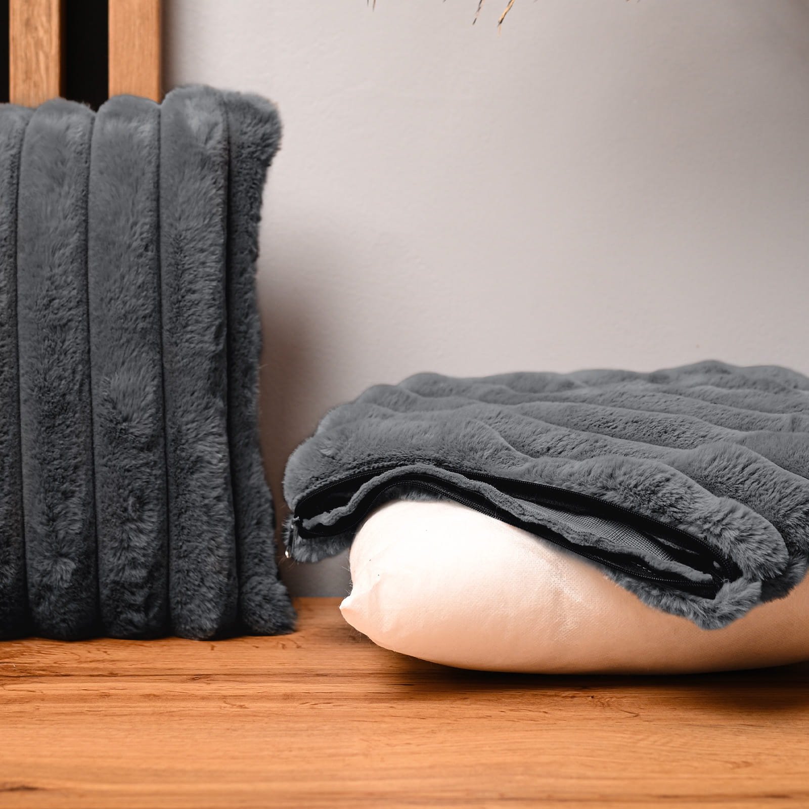 Dekoracyjna poszewka na poduszkę 45x45 cm w kolorze grafitowym z imitacji futra z przeszyciami