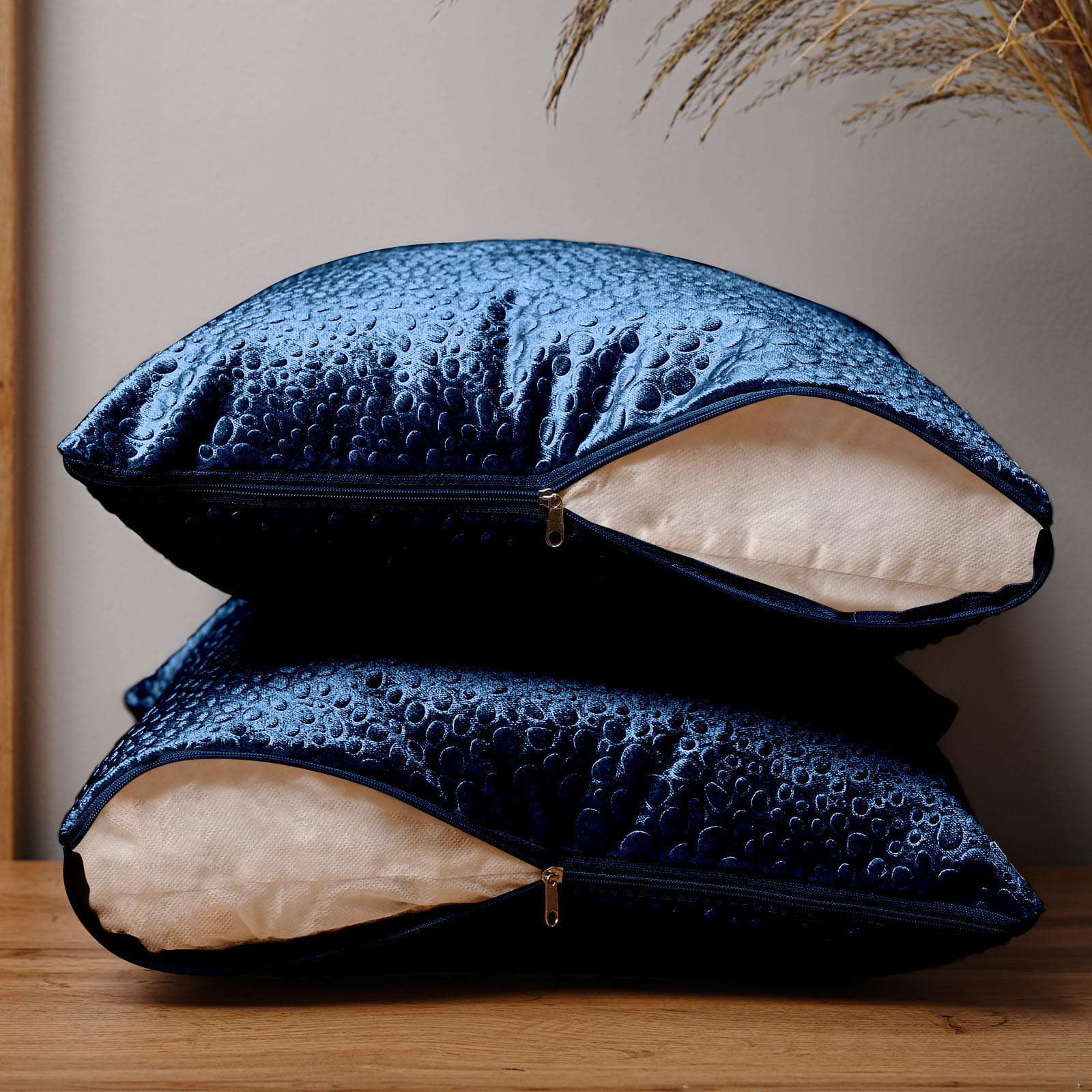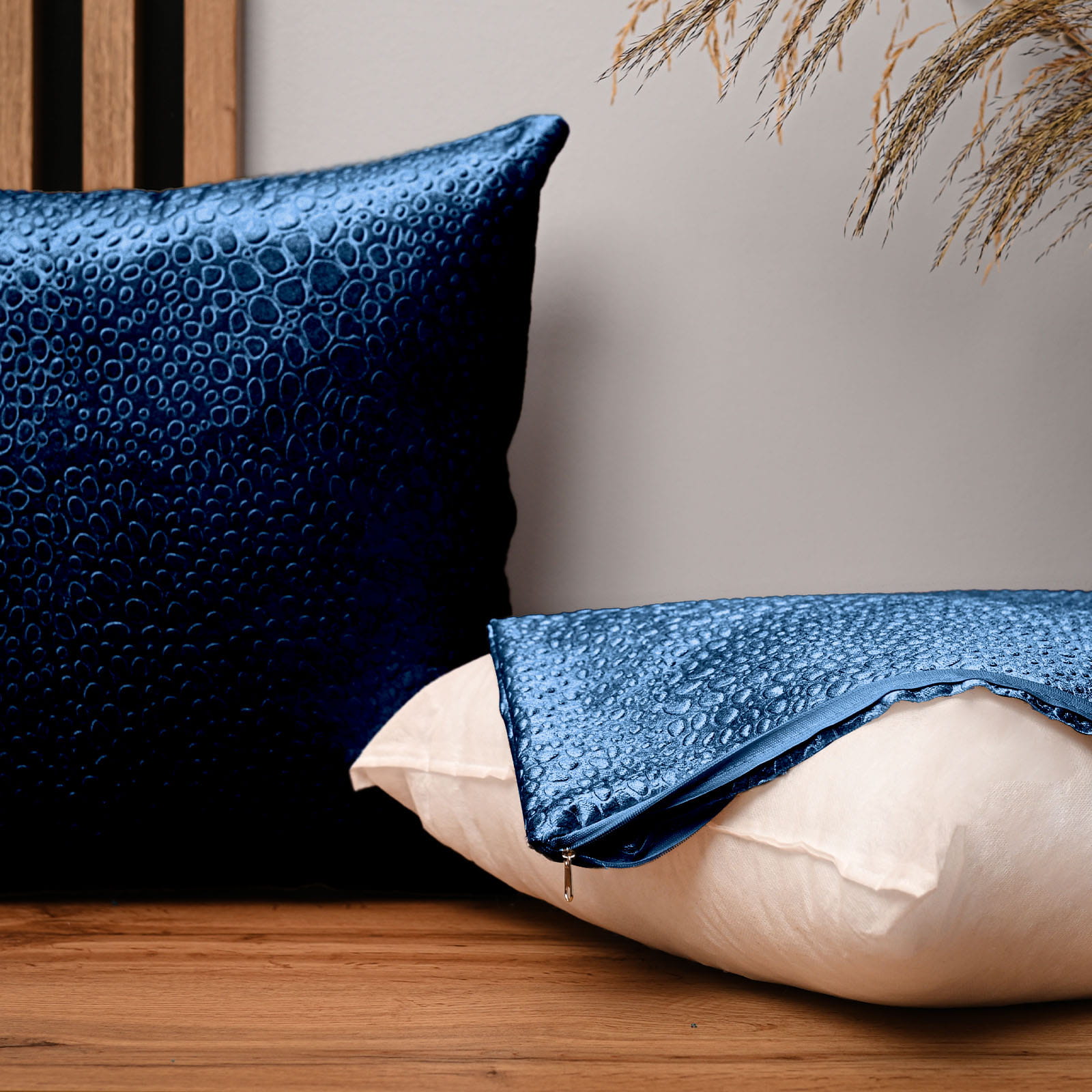 Dekoracyjna poszewka na poduszkę 50x50 cm w kolorze niebieskim z tkaniny welurowej z teksturą “kropelki"