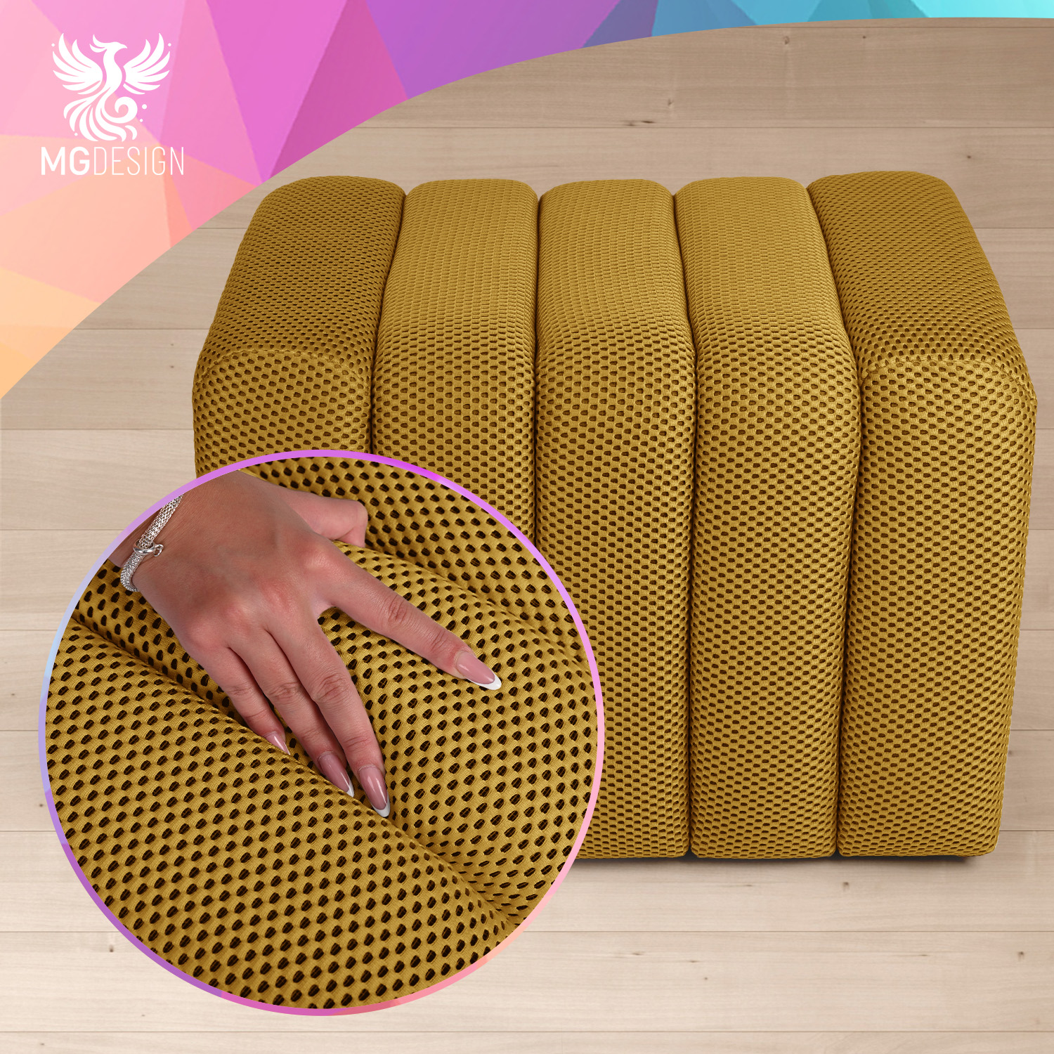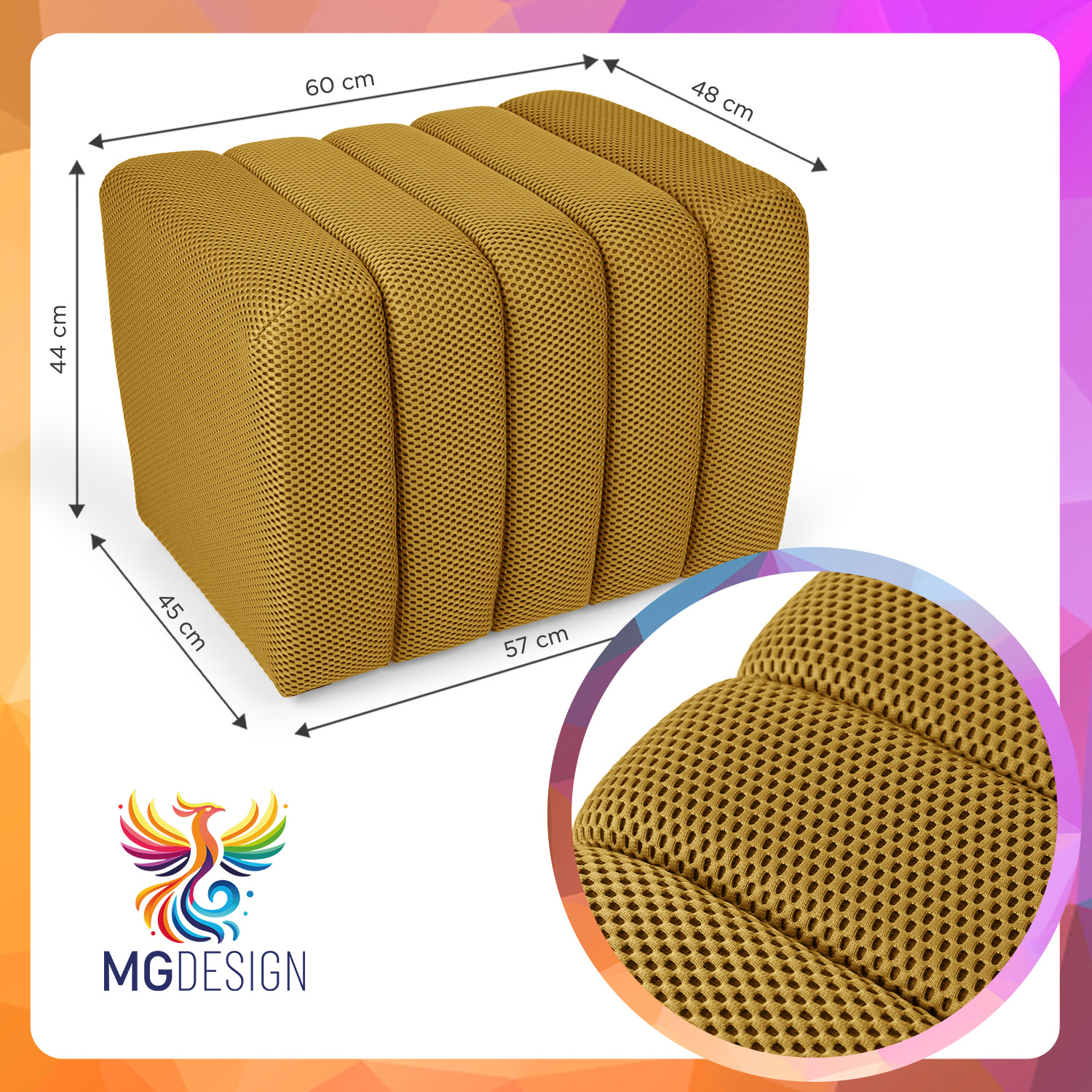 Tapicerowana pufa wyróżnia się wyjątkową trójwymiarową strukturą materiału, która nadaje jej nowoczesny charakter oraz zwiększa komfort użytkowania. Miękka, sprężysta tkanina jest przyjemna w dotyku i zapewnia wygodne siedzisko, dzięki czemu pufa doskonale sprawdzi się jako dodatkowe miejsce do siedzenia lub praktyczny podnóżek.