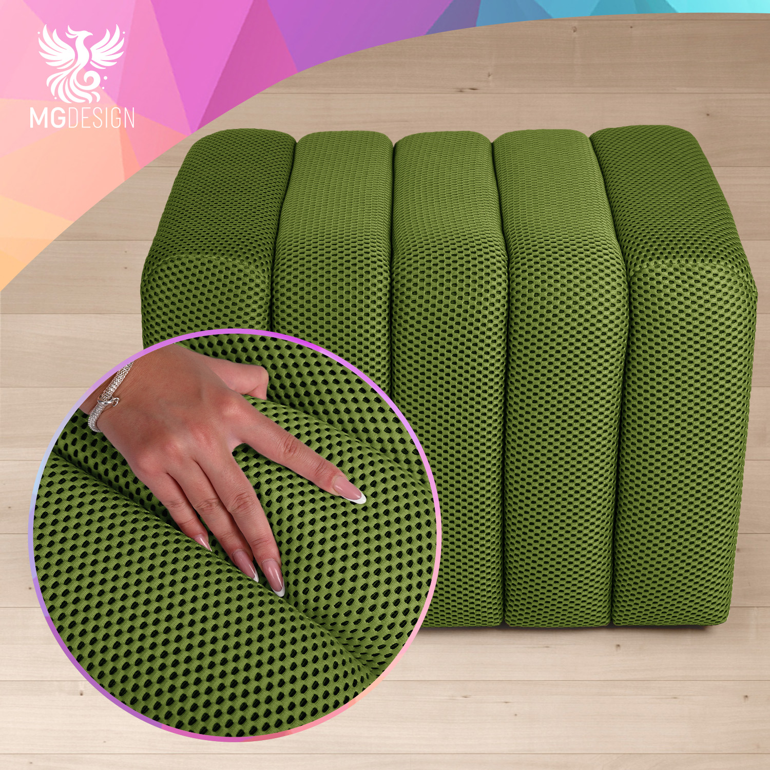 Tapicerowana pufa wyróżnia się wyjątkową trójwymiarową strukturą materiału, która nadaje jej nowoczesny charakter oraz zwiększa komfort użytkowania. Miękka, sprężysta tkanina jest przyjemna w dotyku i zapewnia wygodne siedzisko, dzięki czemu pufa doskonale sprawdzi się jako dodatkowe miejsce do siedzenia lub praktyczny podnóżek.