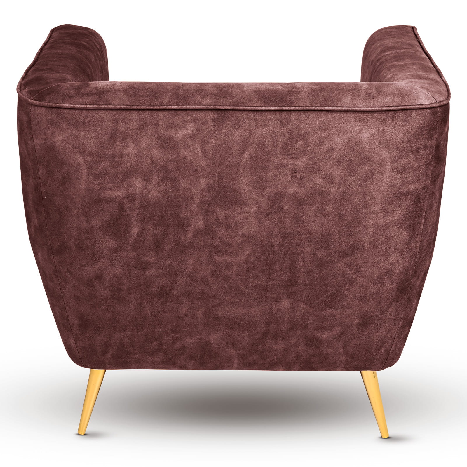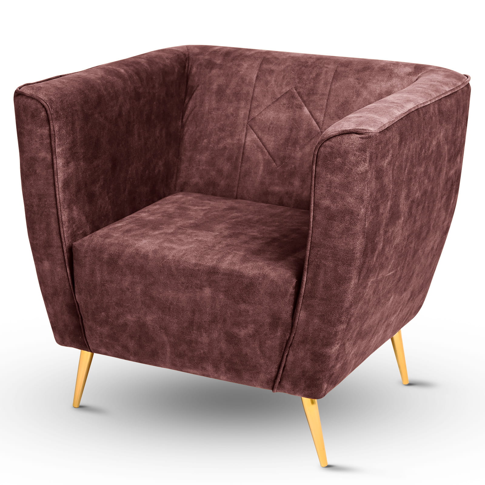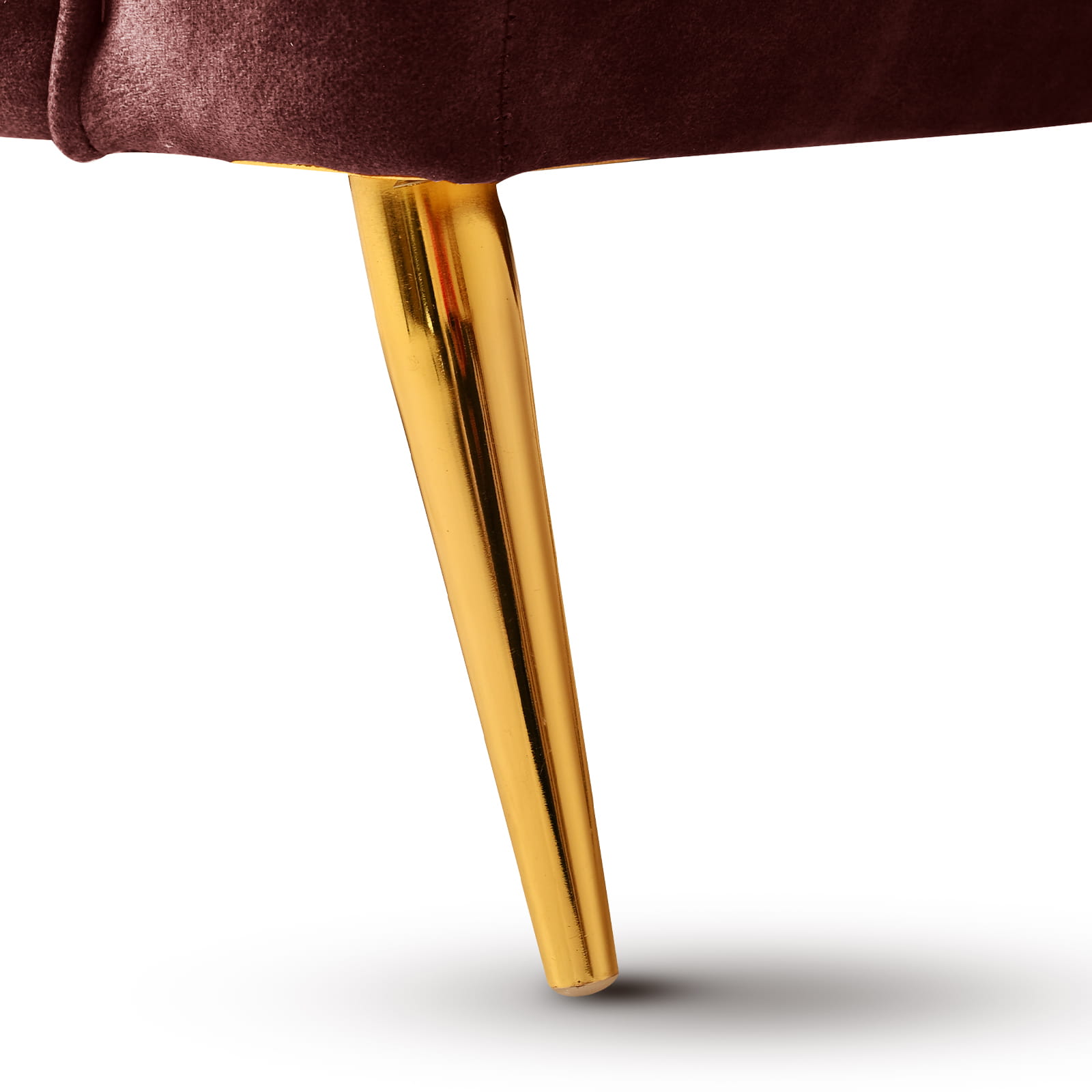 Fotel Lara z welurowej tkaniny w kolorze brązowo-czerwonym z przeszyciami i złotymi nogami