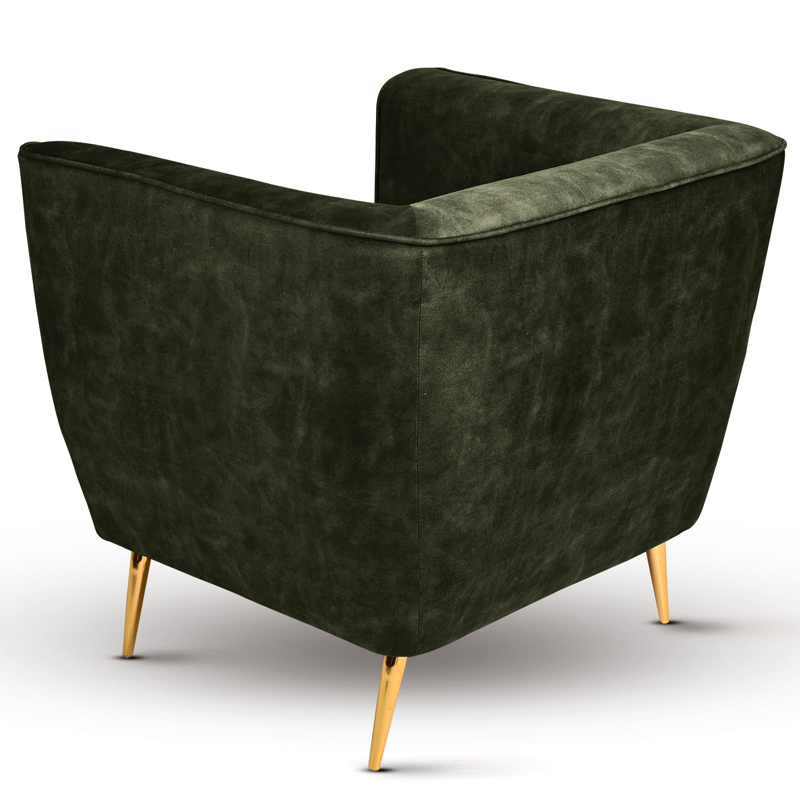 Fotel Lara z welurowej tkaniny w kolorze ciemnozielonym z przeszyciami i złotymi nogami