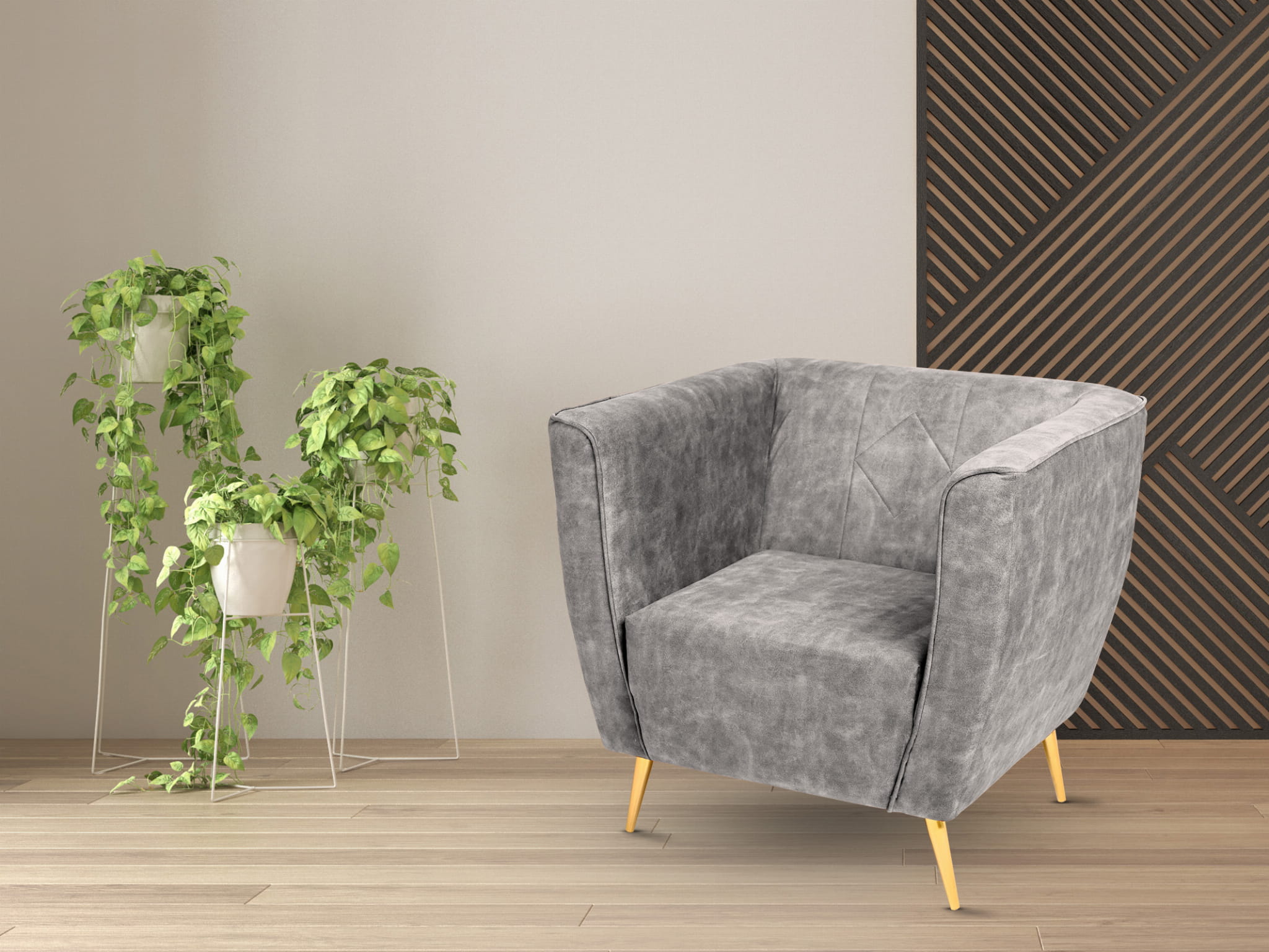 Fotel Lara z welurowej tkaniny w kolorze jasnoszarym z przeszyciami i złotymi nogami