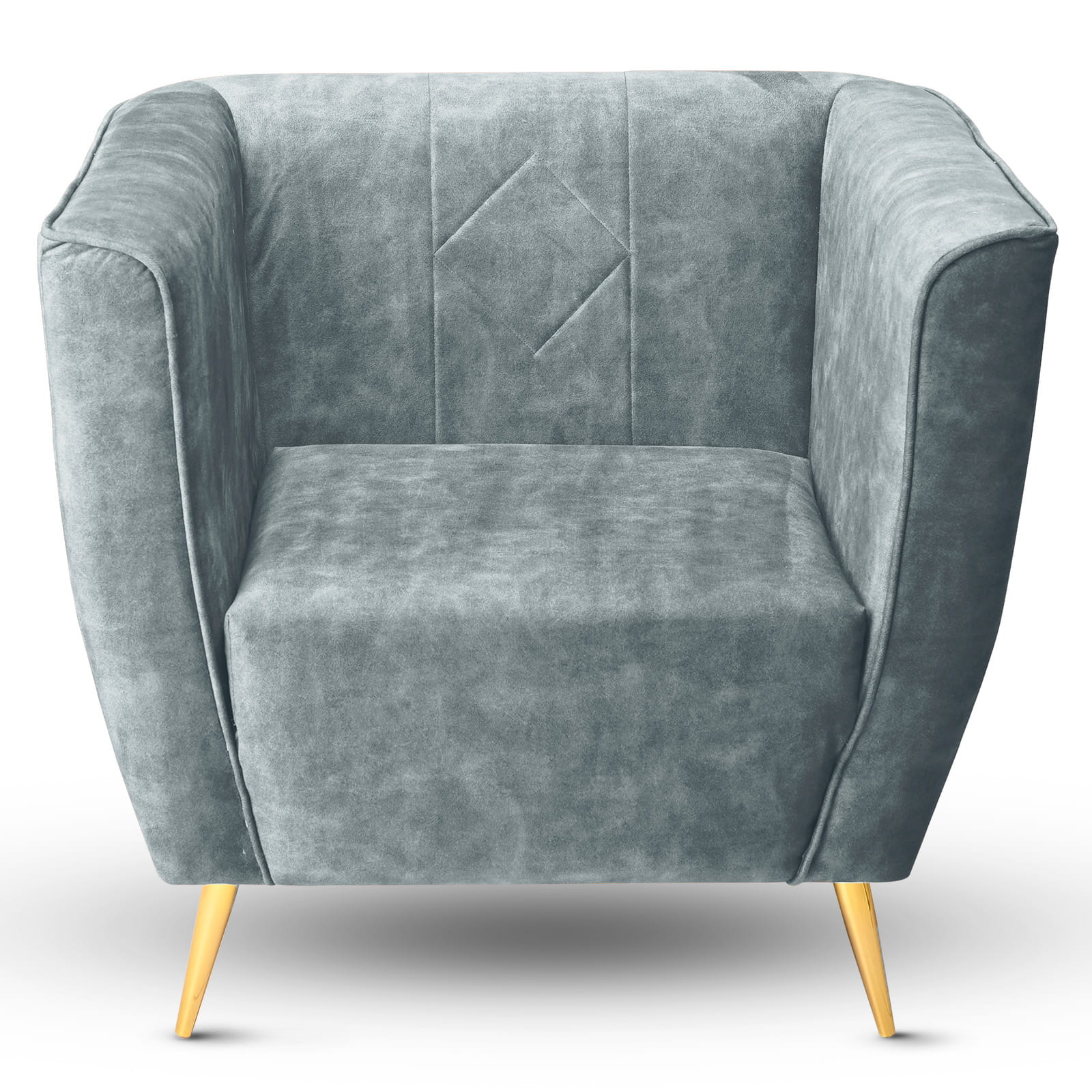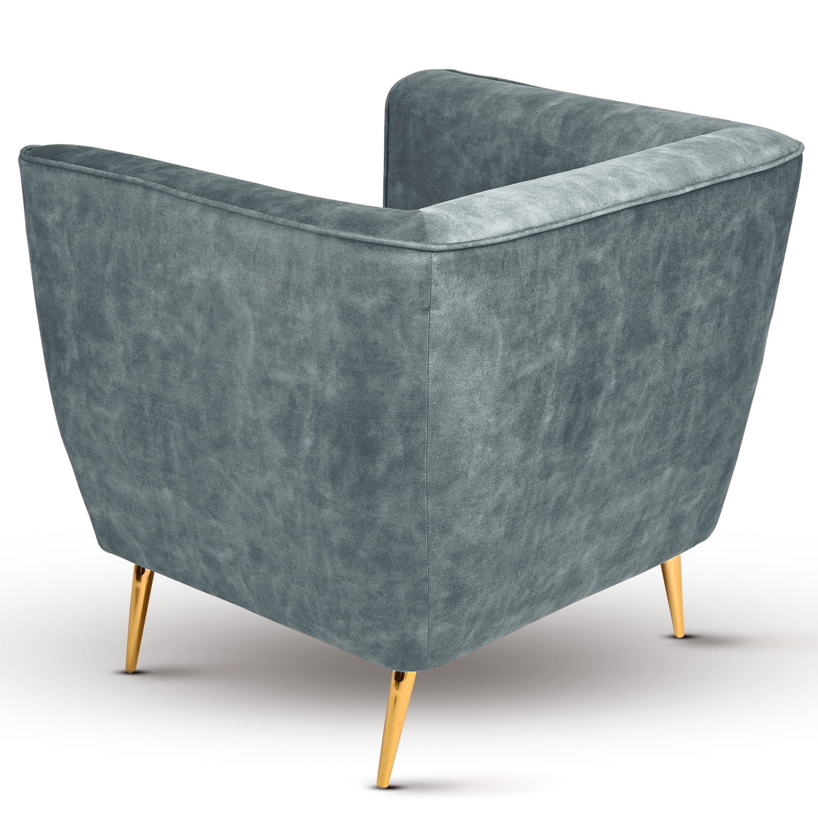 Fotel Lara z welurowej tkaniny w kolorze stalowym z przeszyciami i złotymi nogami