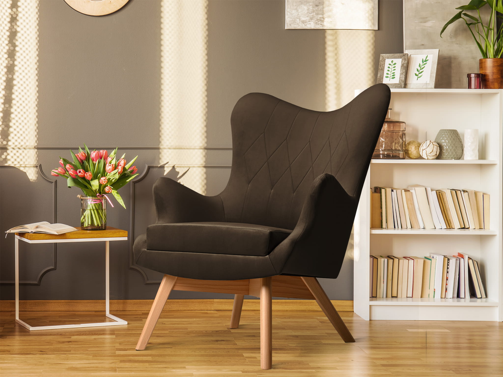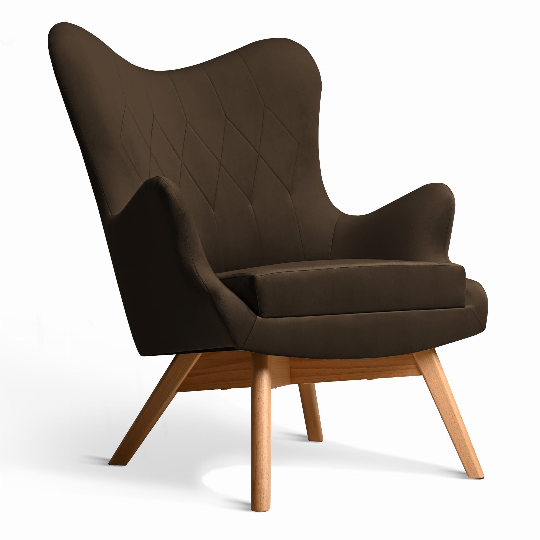Fotel uszak Bergen w kolorze czekoldowym z drewnianymi nóżkami w stylu skandynawskim