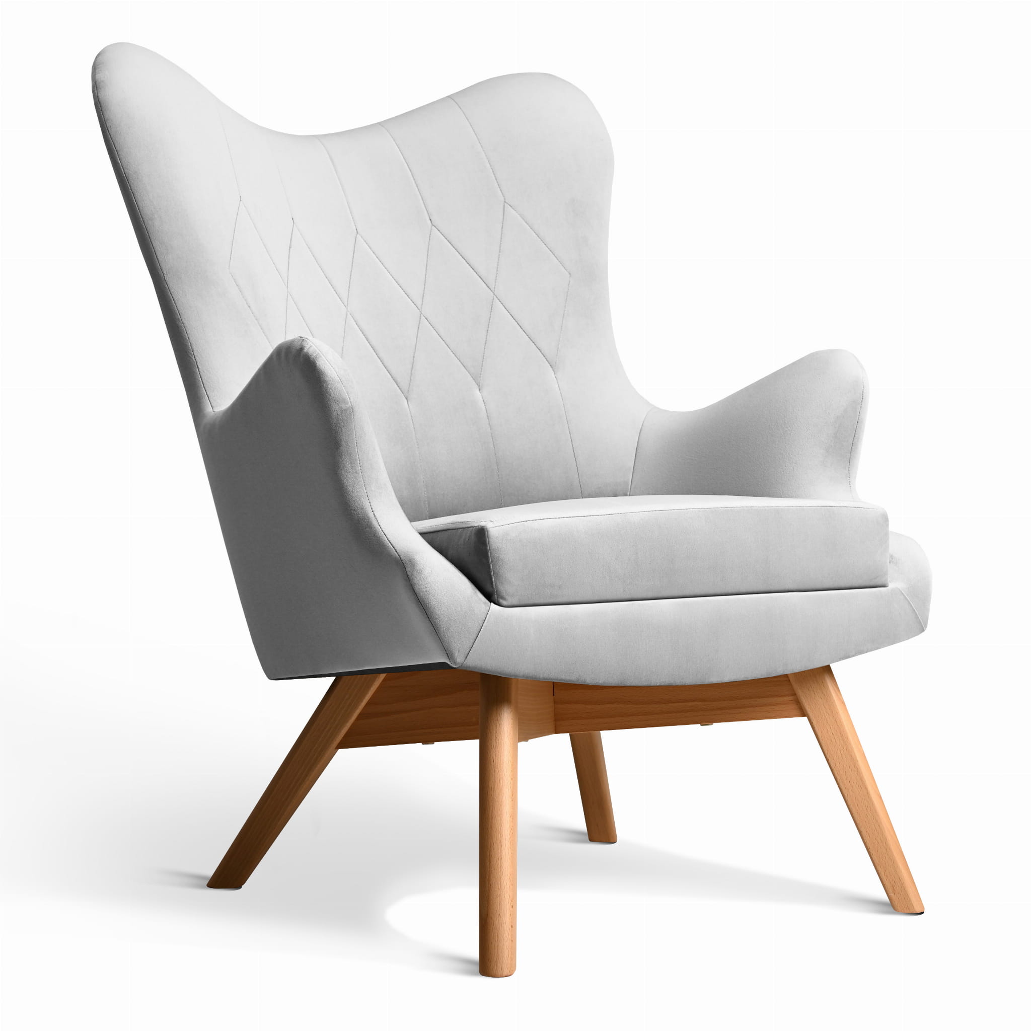 Fotel uszak Bergen w kolorze jasnoszarym z drewnianymi nóżkami w stylu skandynawskim