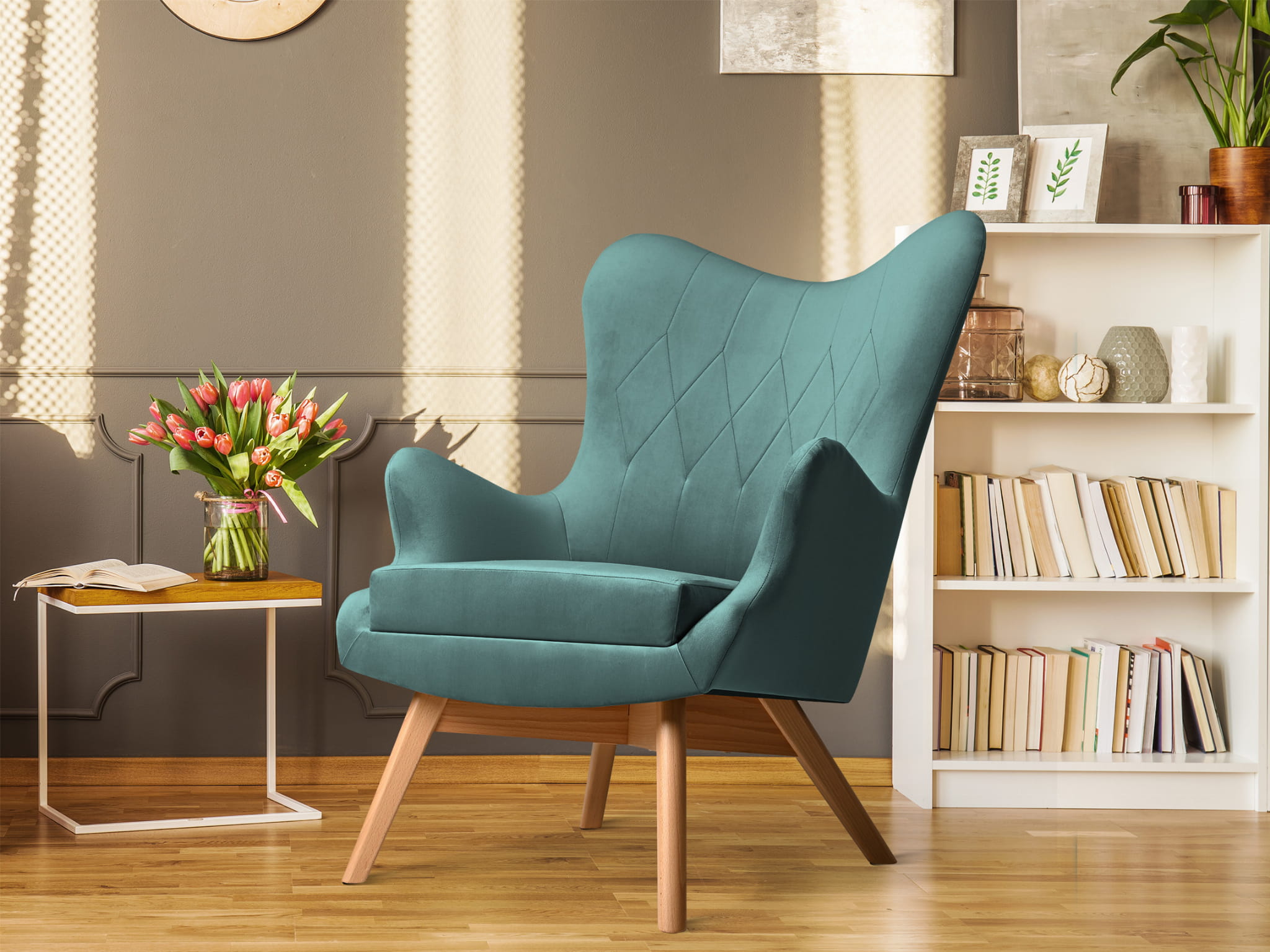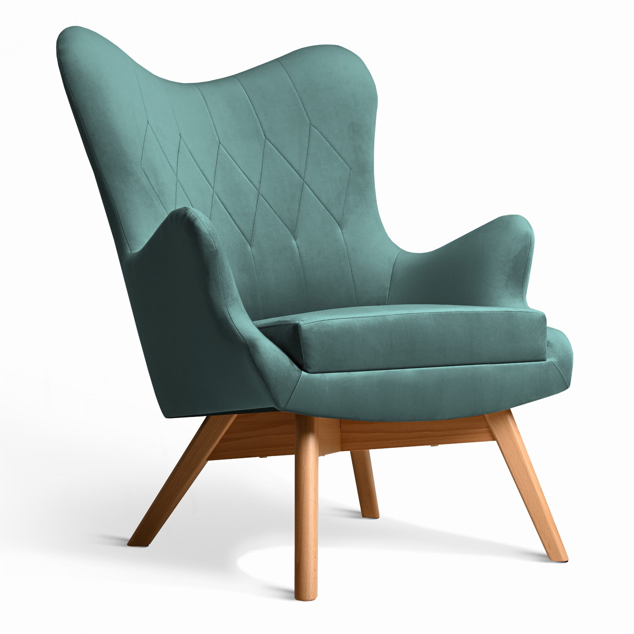 Fotel uszak Bergen w kolorze morskim z drewnianymi nóżkami w stylu skandynawskim