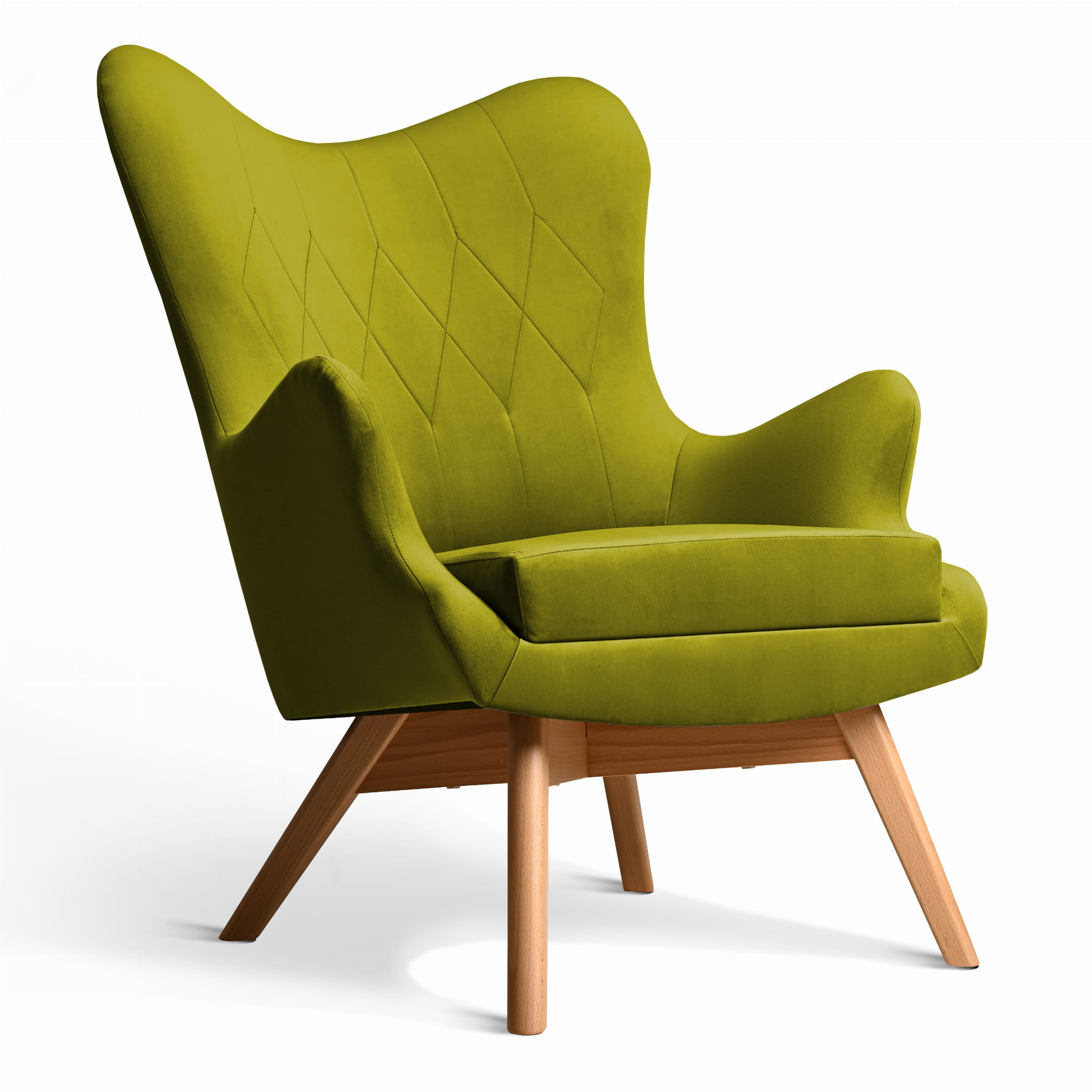 Fotel uszak Bergen w kolorze oliwkowym z drewnianymi nóżkami w stylu skandynawskim