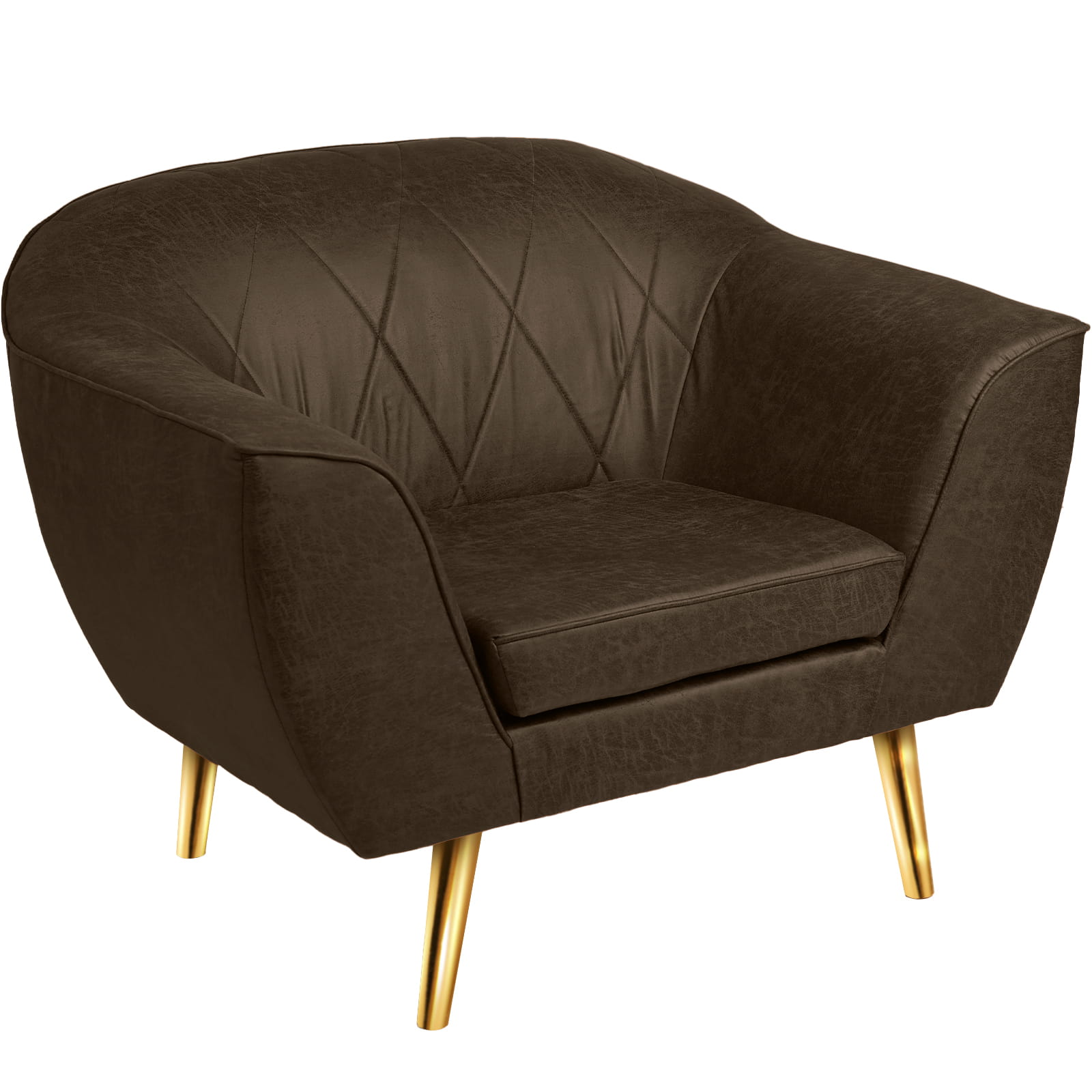 Fotel z imitacji skóry o eleganckich przeszyciach i złotych nóżkach to idealny mebel, który doda luksusowego akcentu każdemu wnętrzu.