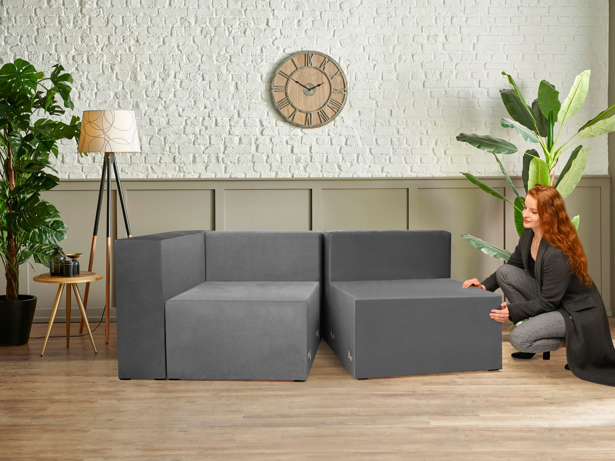 Moduł: tapicerowana otomana LEON w kolorze szarym z metalowymi łącznikami – segment do zestawu mebli modułowych