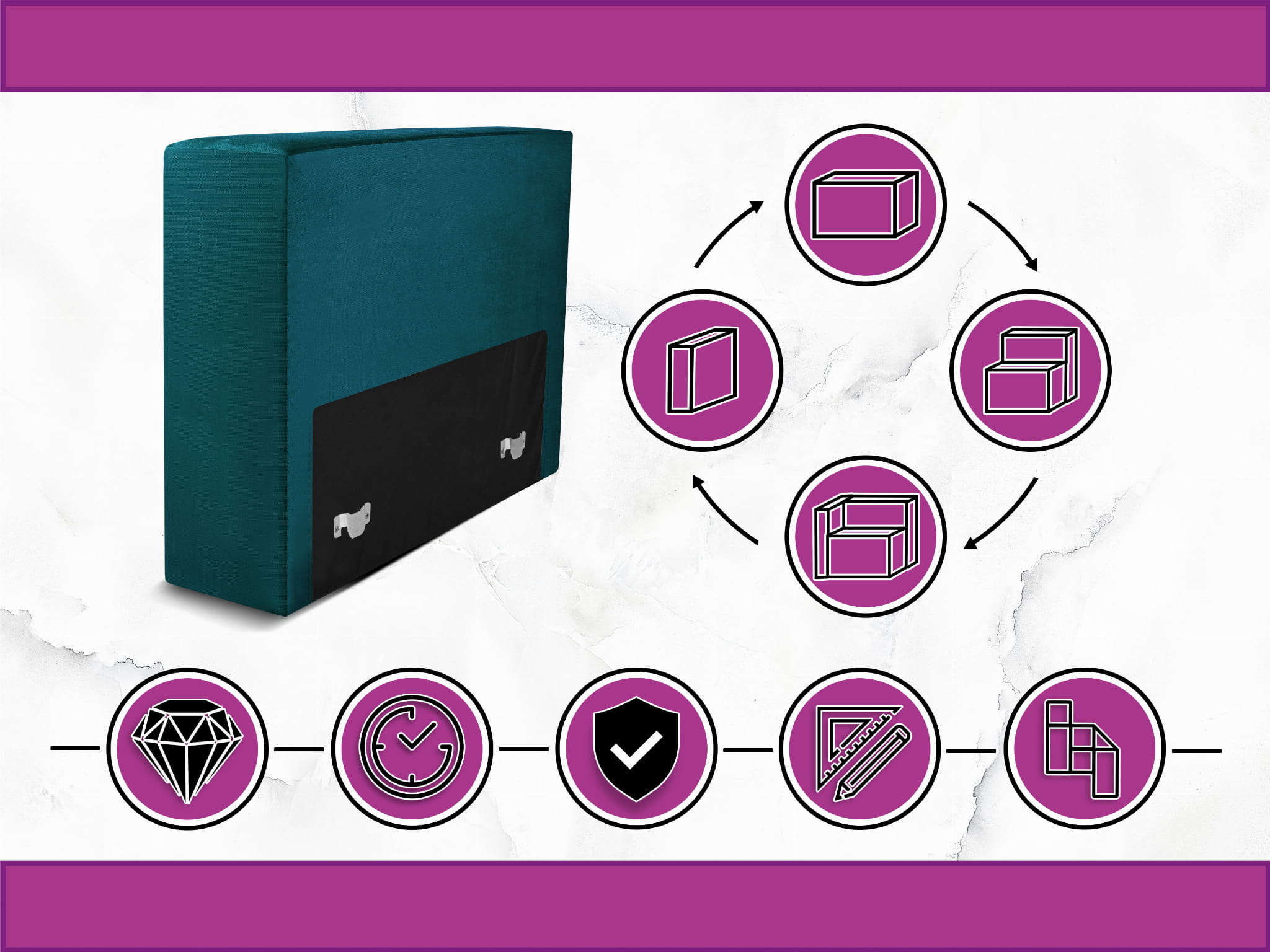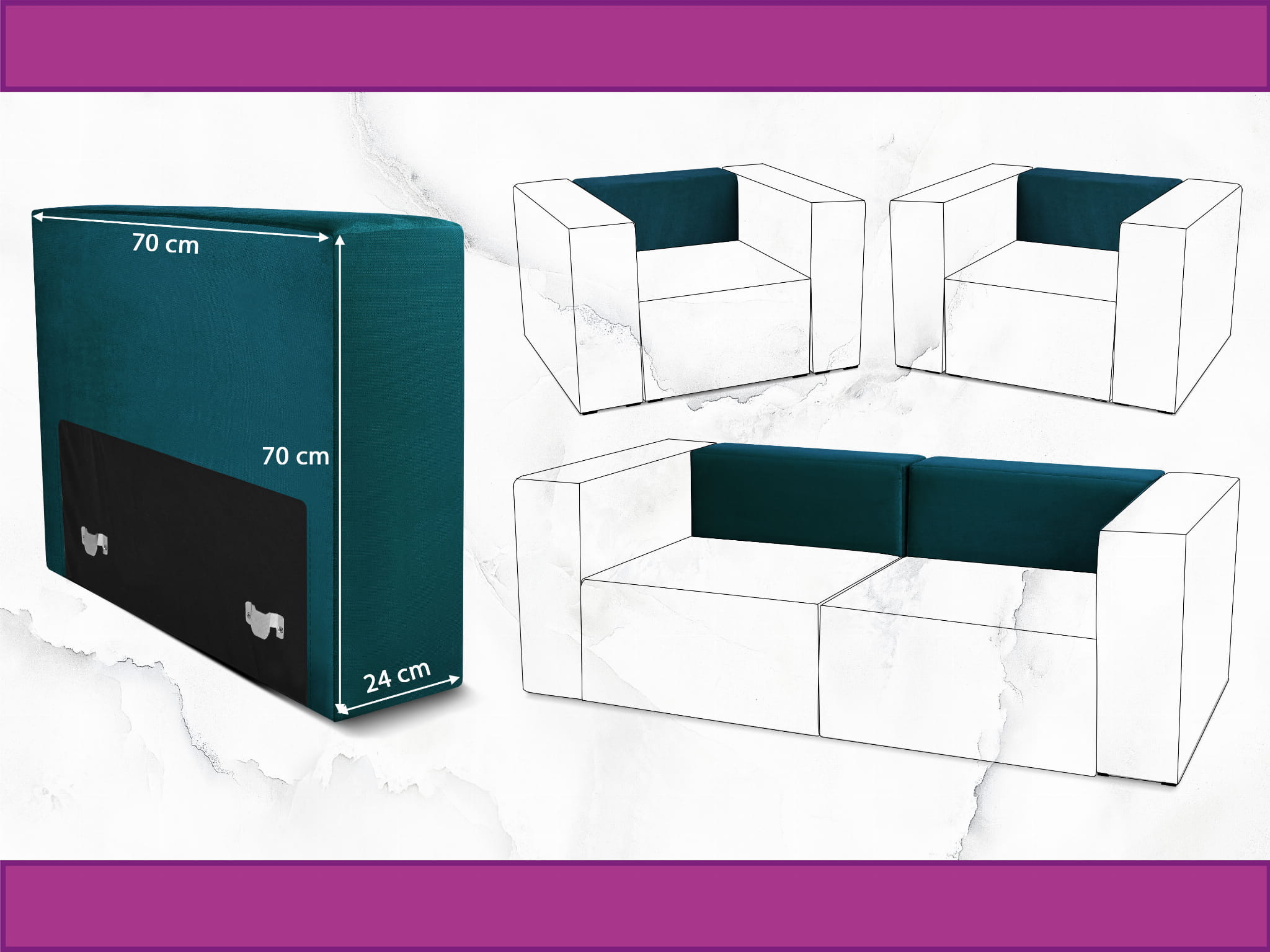 Moduł: tapicerowane oparcie 70 LEON w kolorze turkusowym z metalowymi łącznikami – segment do zestawu mebli modułowych