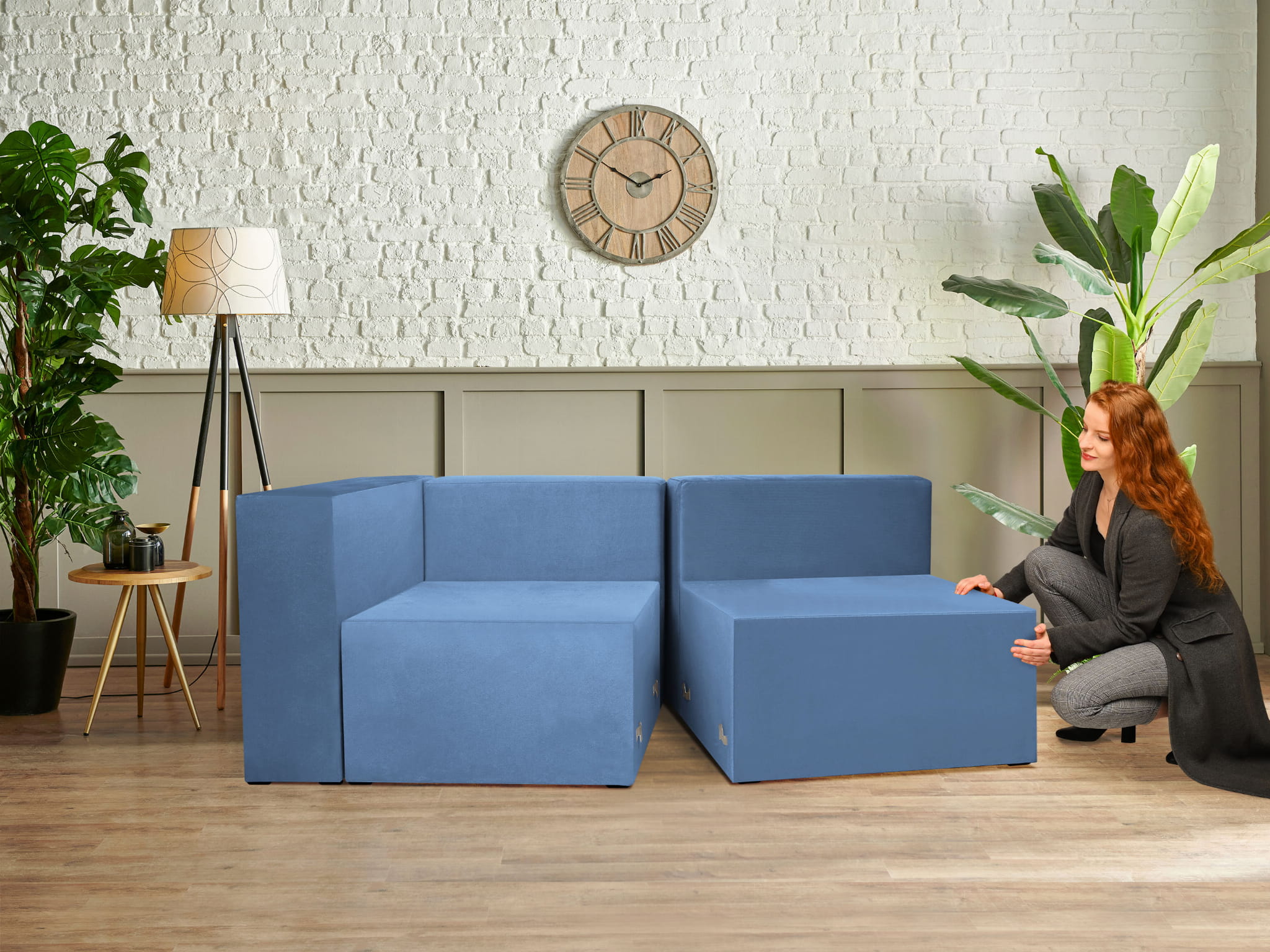 Miękkie tapicerowane siedzisko w kolorze niebieskim LEON – element systemu modułowego do połączenia z pozostałymi modułami
