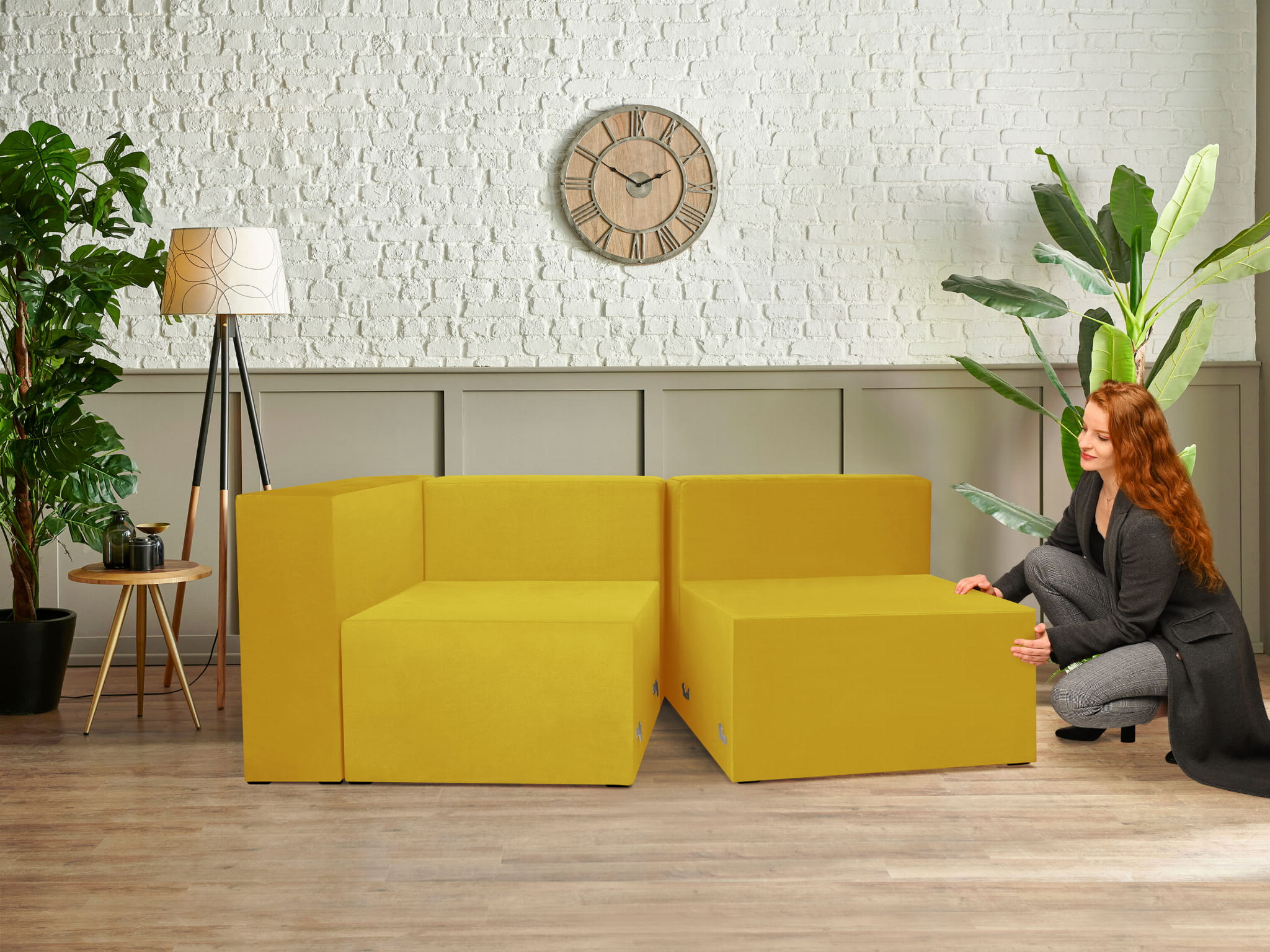 Miękkie tapicerowane siedzisko w kolorze żółtym LEON – element systemu modułowego do połączenia z pozostałymi modułami
