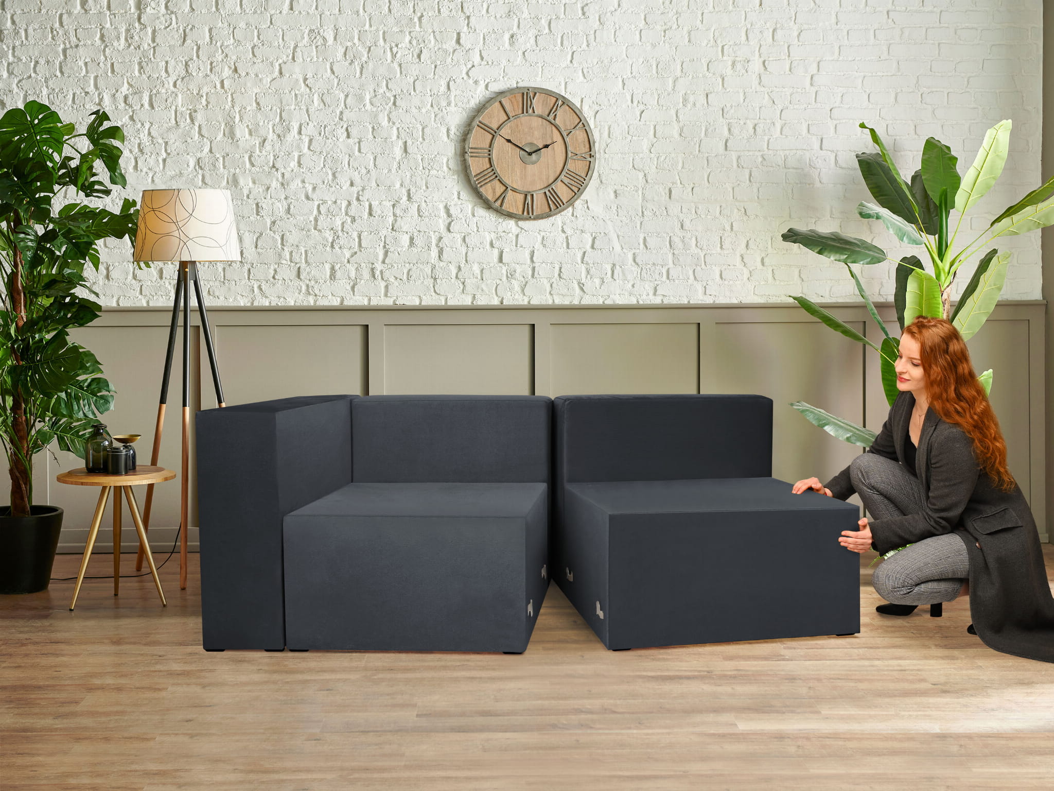 Miękkie tapicerowane siedzisko narożne w kolorze grafitowym LEON – element systemu modułowego do połączenia z pozostałymi modułami