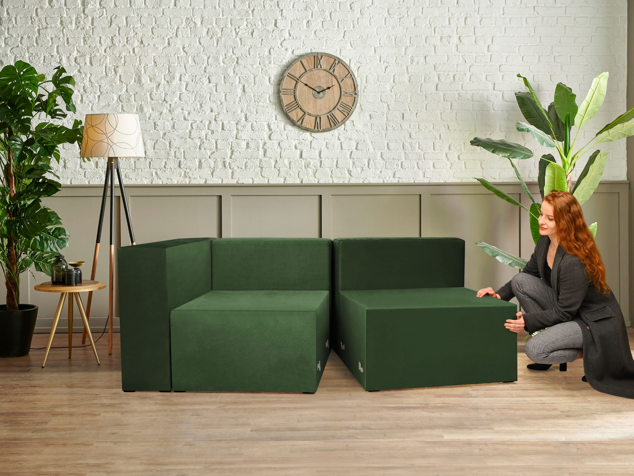 Miękkie tapicerowane siedzisko narożne w kolorze zielonym LEON – element systemu modułowego do połączenia z pozostałymi modułami