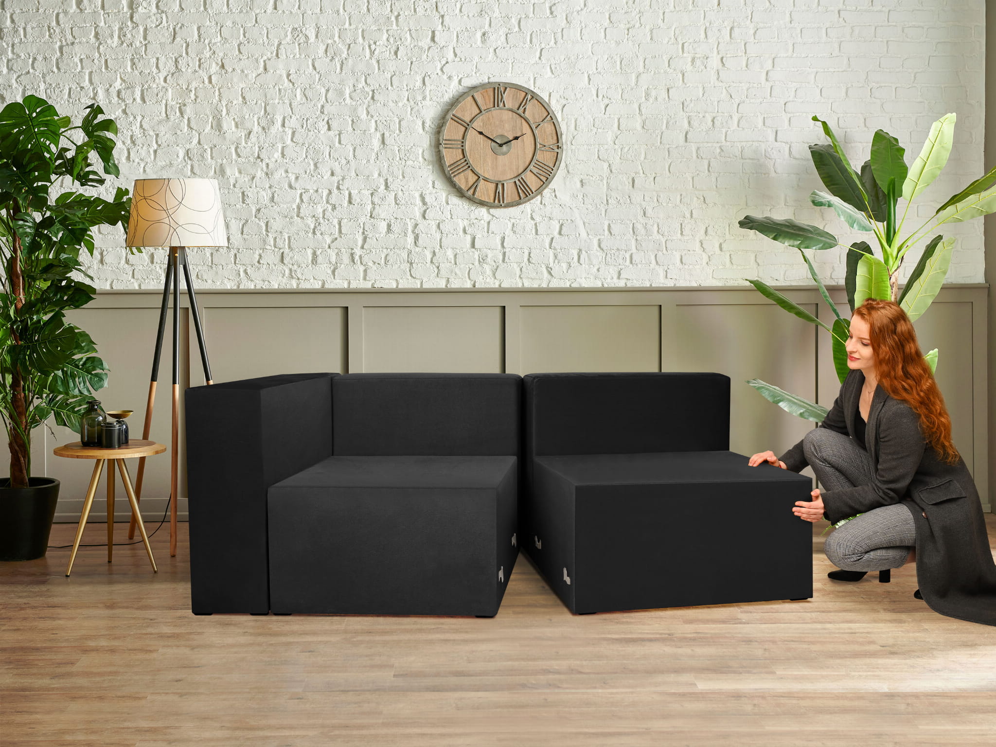 Miękkie tapicerowane siedzisko narożne w kolorze czarnym LEON – element systemu modułowego do połączenia z pozostałymi modułami