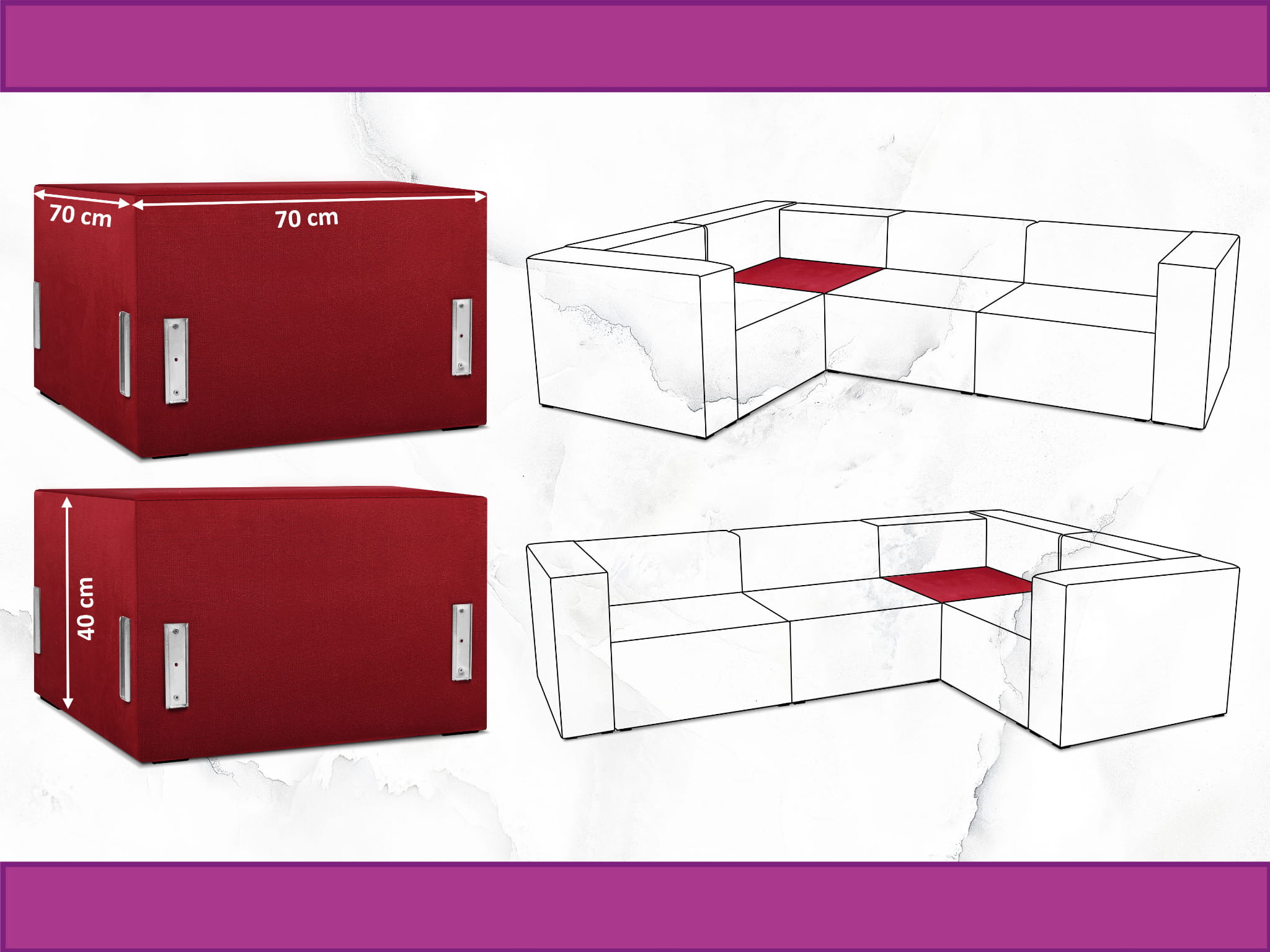 Moduł: tapicerowane siedzisko narożne LEON w kolorze czerwonym z metalowymi łącznikami – segment do zestawu mebli modułowych