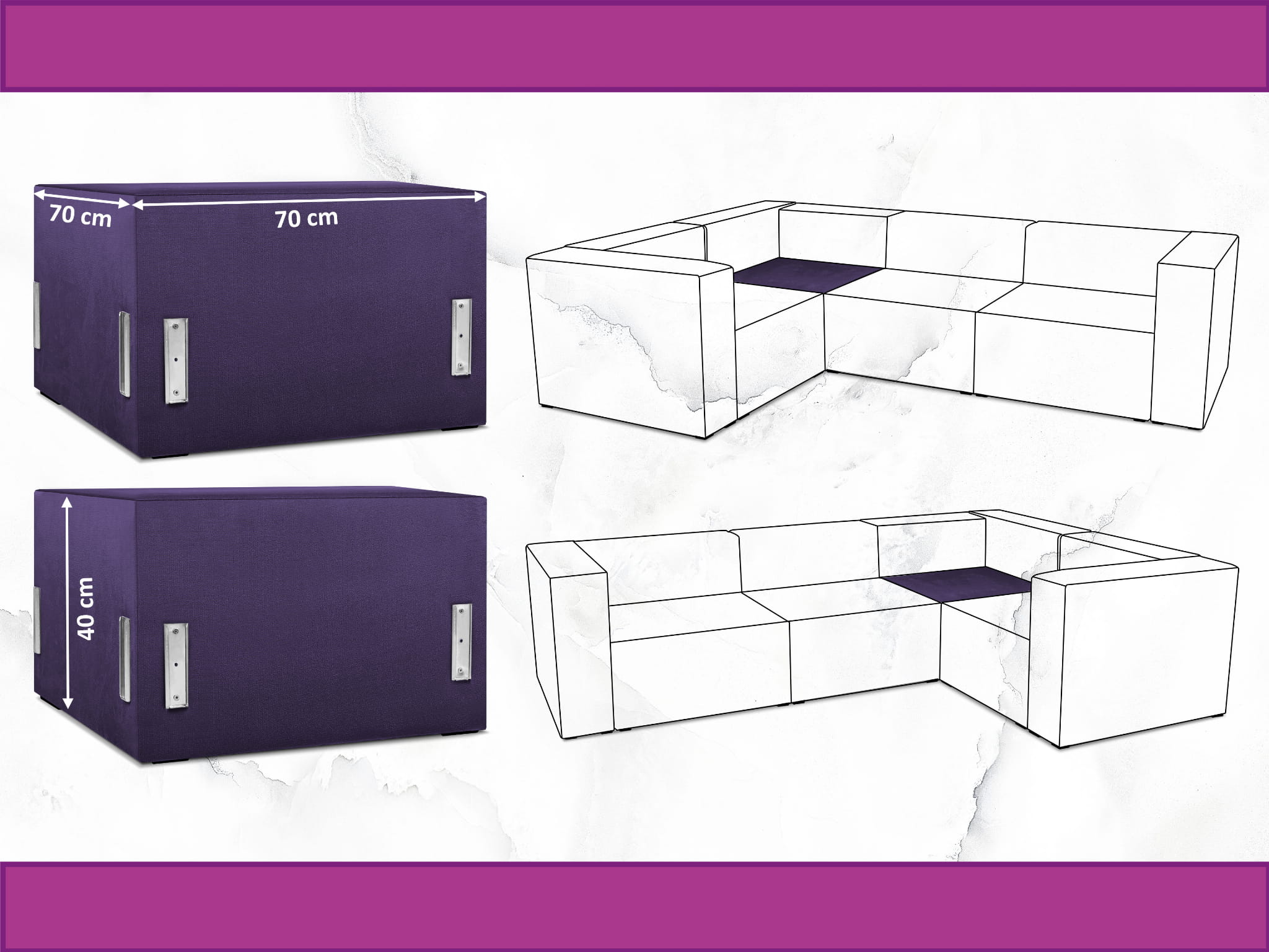 Moduł: tapicerowane siedzisko narożne LEON w kolorze fioletowym z metalowymi łącznikami – segment do zestawu mebli modułowych