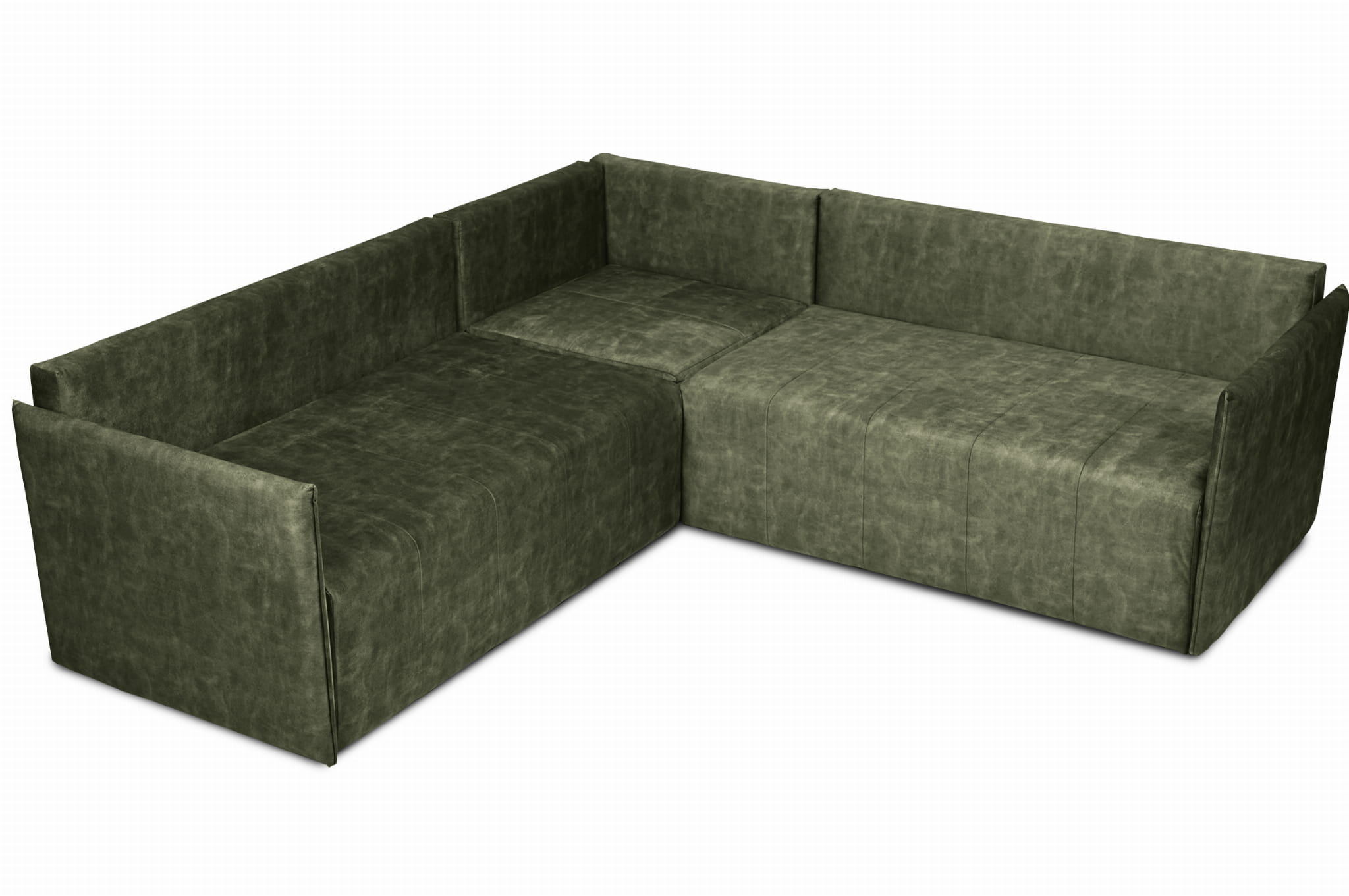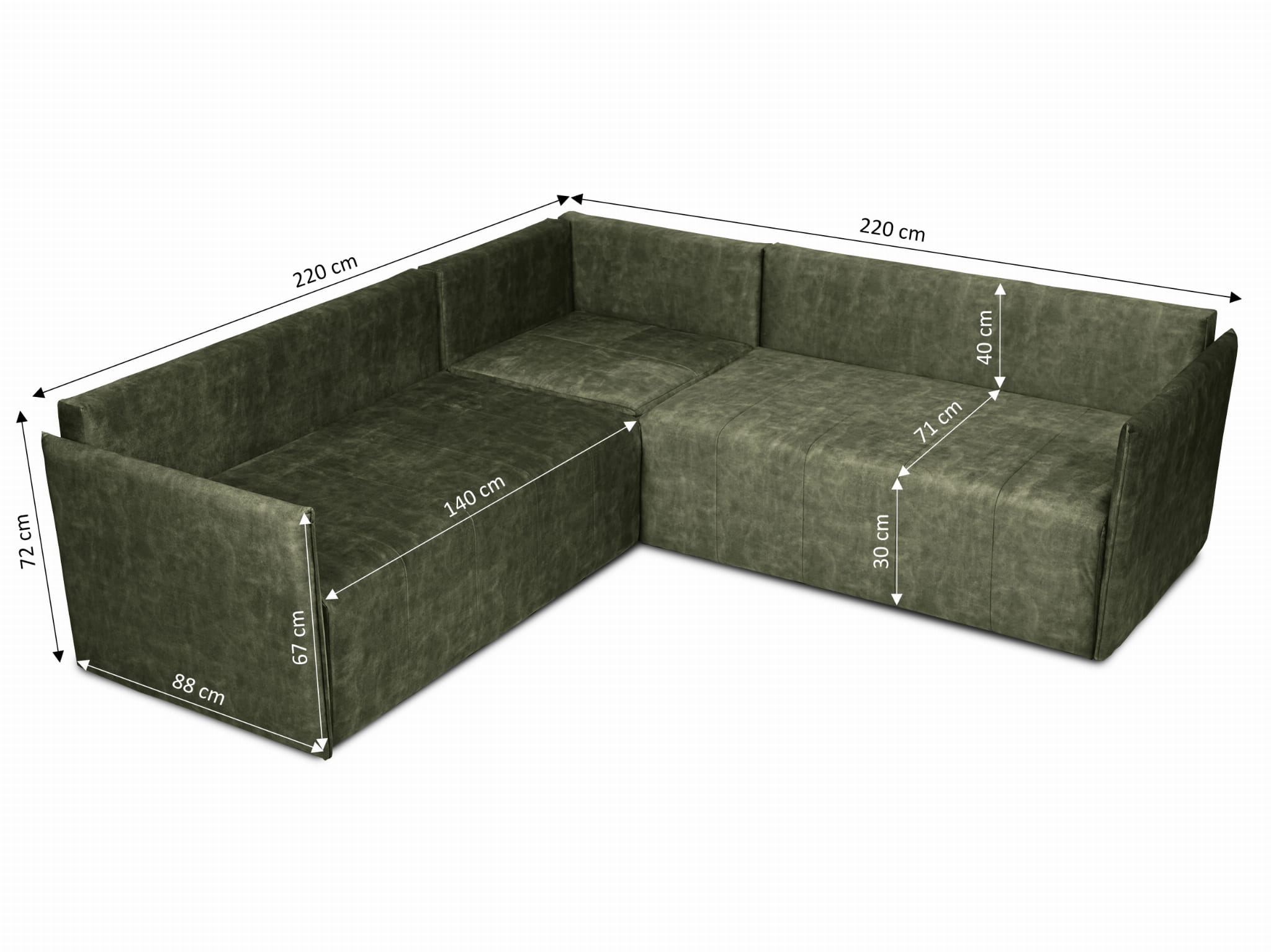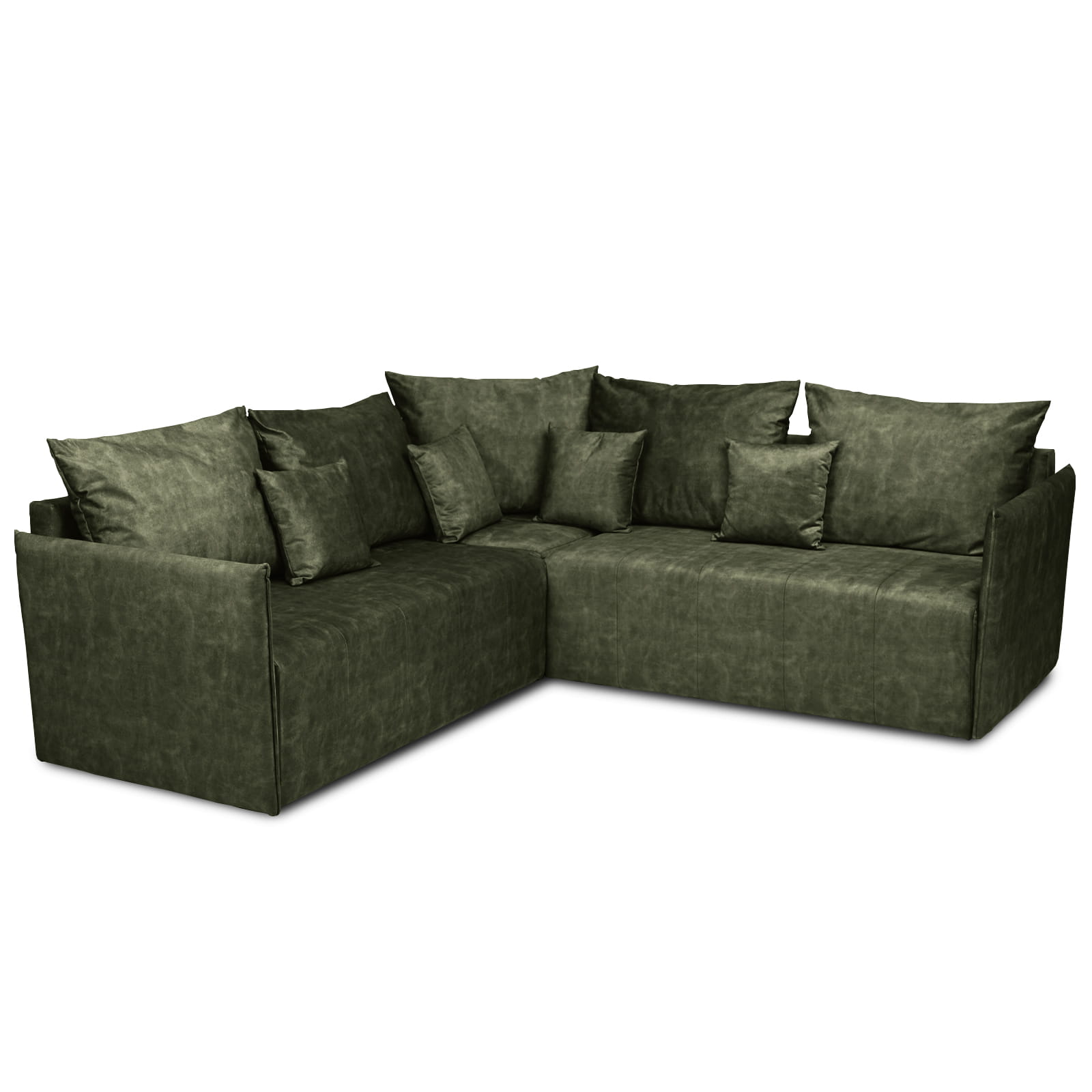 Narożnik OLAF z miękkimi poduszkami z welurowej tkaniny w kolorze ciemnozielonym – wygodna sofa narożna do salonu