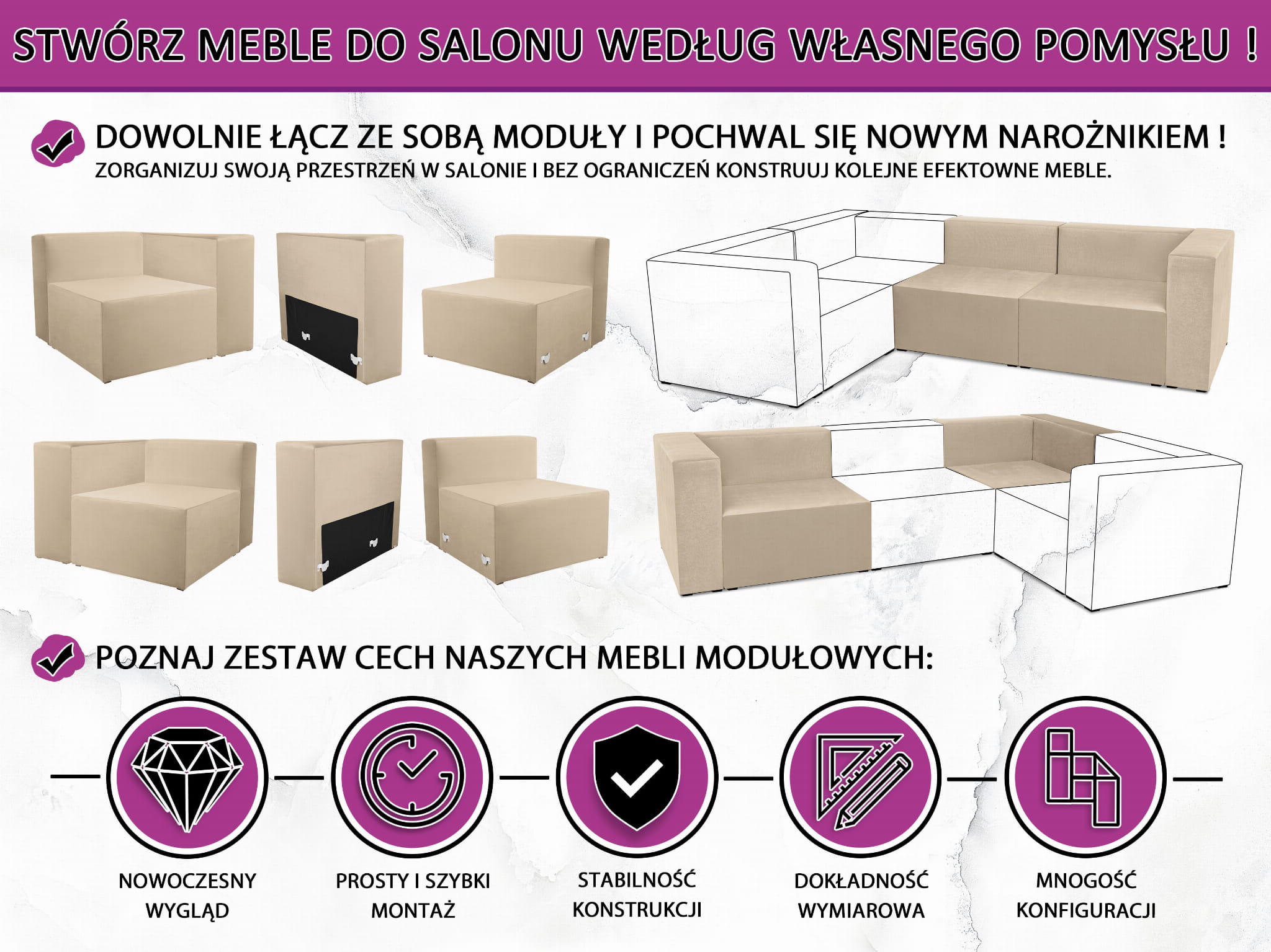 Narożnik modułowy 3-osobowy LEON w kolorze beżowym – segment do zestawu mebli modułowych: 4 siedziska, 5 oparć, 2 podłokietniki