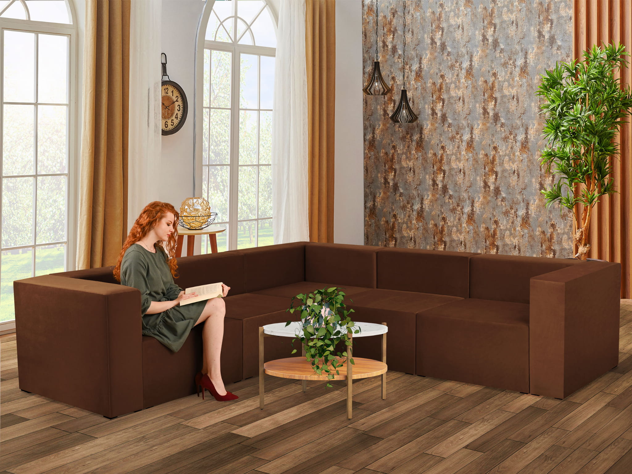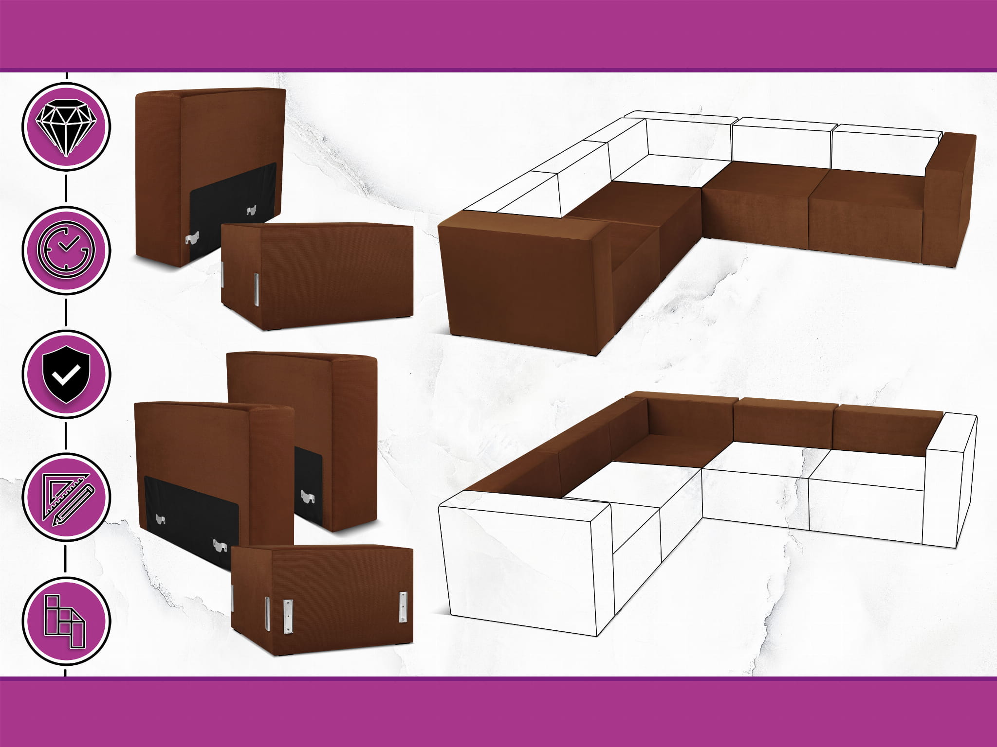 Czterosobowy narożnik modułowy w kolorze brązowym LEON – element systemu modułowego samodzielny i do połączenia