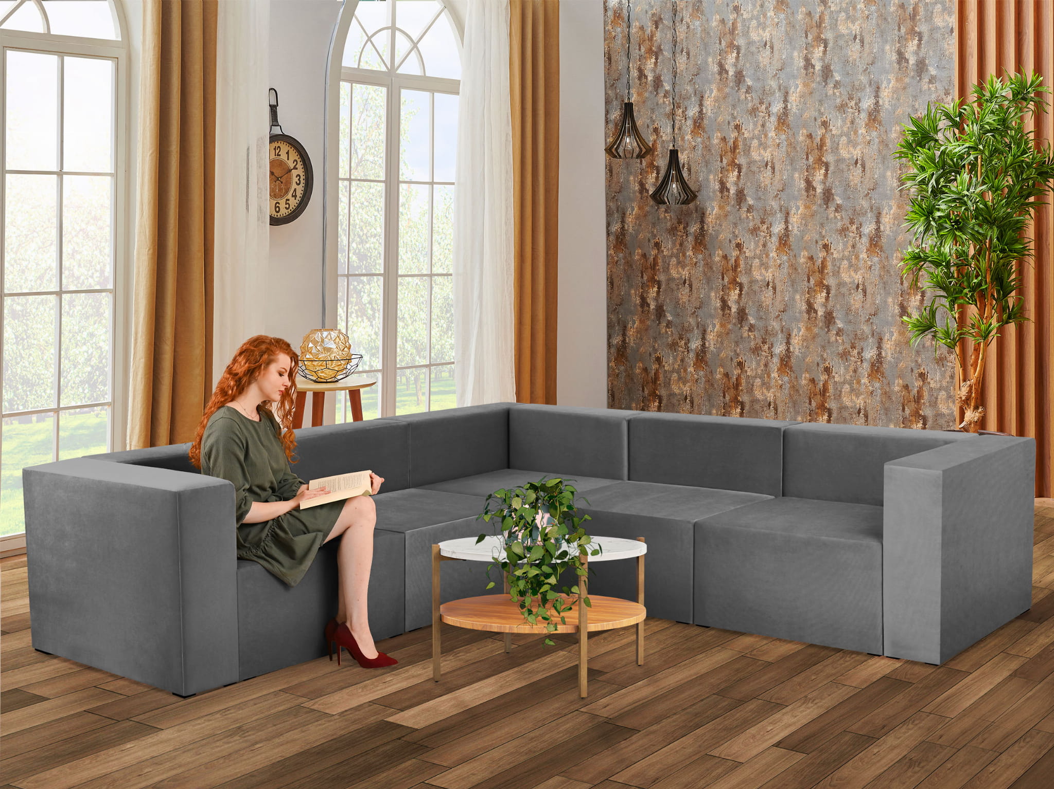 Narożnik modułowy 4-osobowy LEON w kolorze szarym – segment do zestawu mebli modułowych: 5 siedzisk, 6 oparć, 2 podłokietniki
