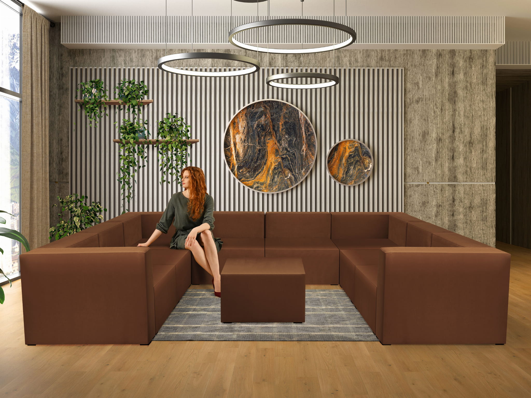 Sześciooosbowy narożnik modułowy w kształcie litery U z podnóżkiem w kolorze brązowym LEON – element systemu modułowego samodzielny i do połączenia