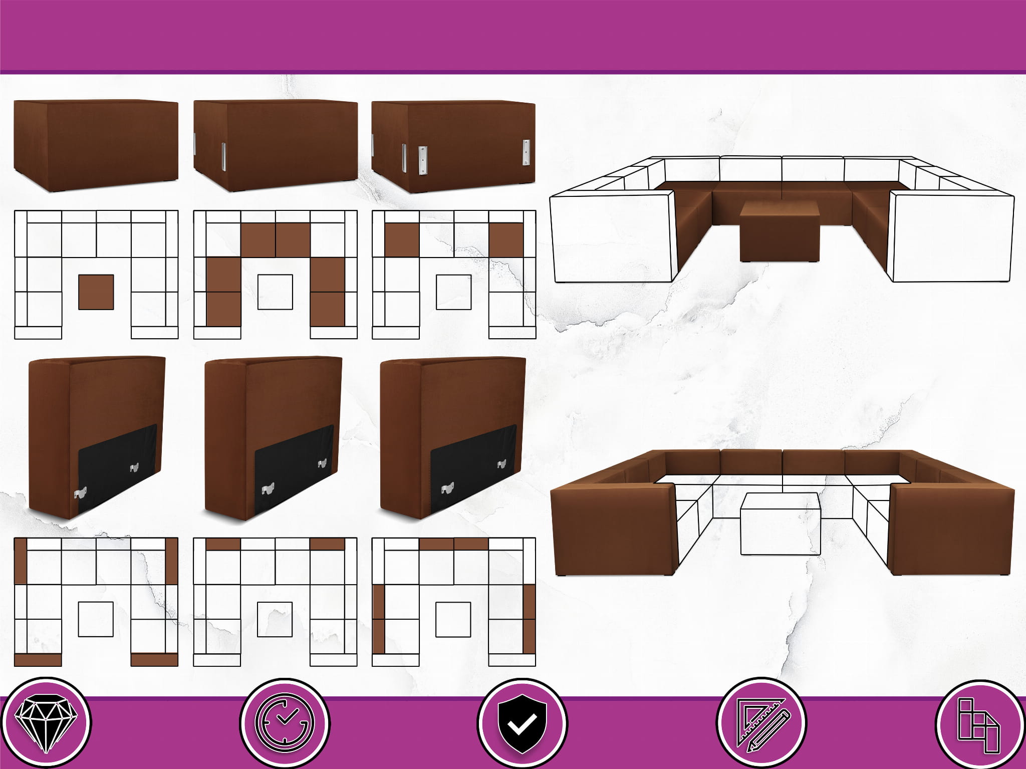 Narożnik modułowy w kształcie litery U z podnóżkiem 6-osobowy LEON w kolorze brązowym – segment do zestawu mebli modułowych: 9 siedzisk, 10 oparć, 2 podłokietniki