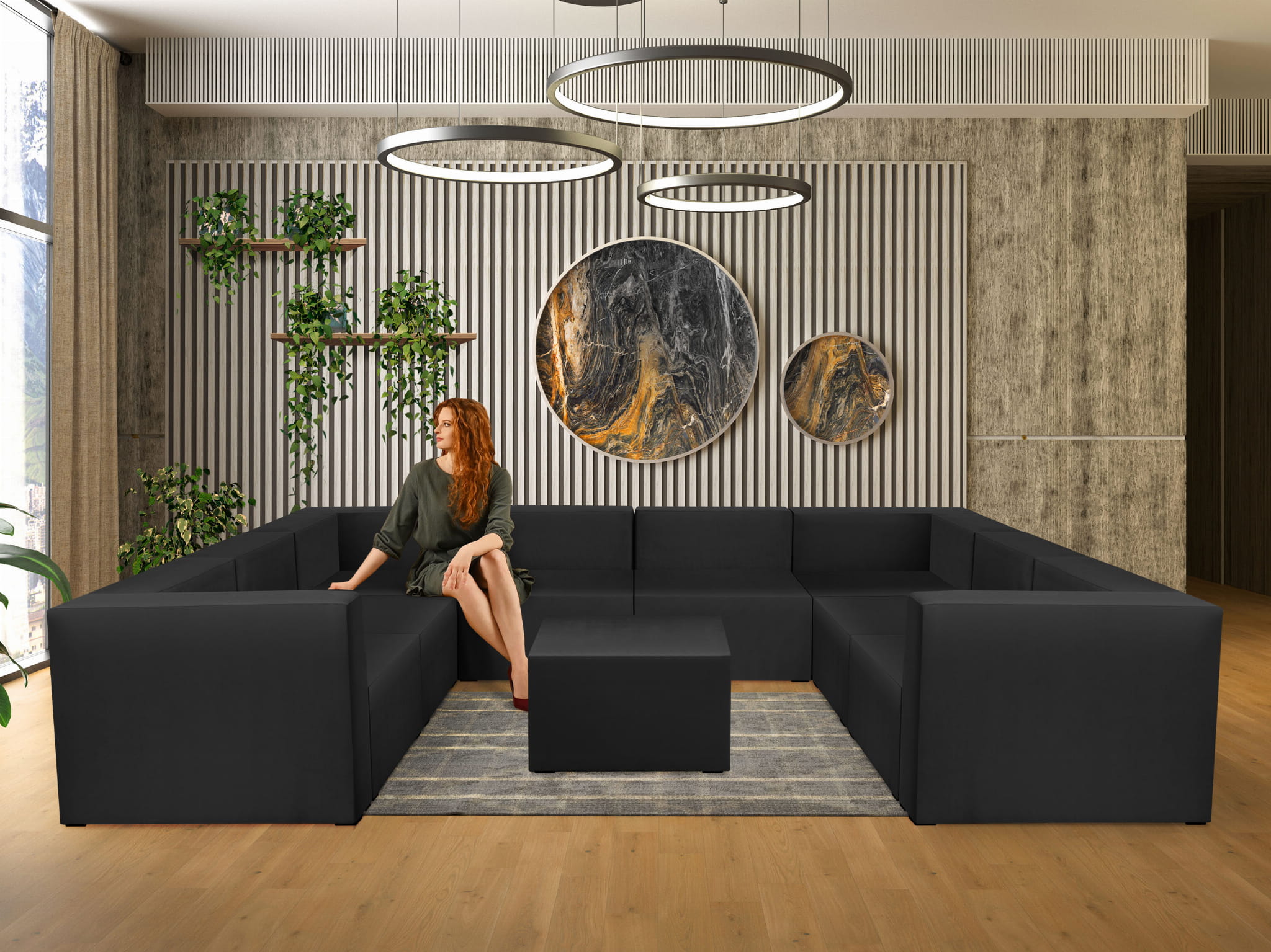Narożnik modułowy w kształcie litery U z podnóżkiem 6-osobowy LEON w kolorze czarnym – segment do zestawu mebli modułowych: 9 siedzisk, 10 oparć, 2 podłokietniki