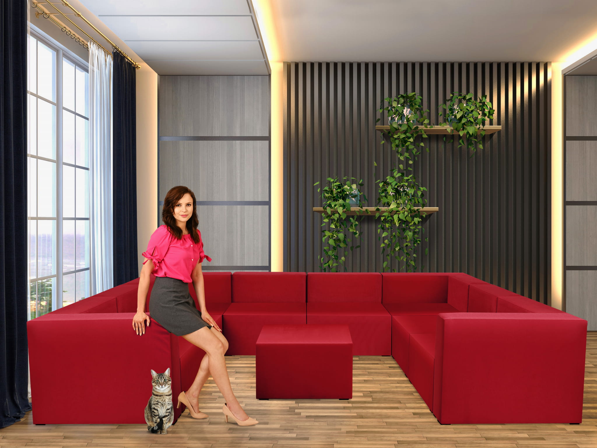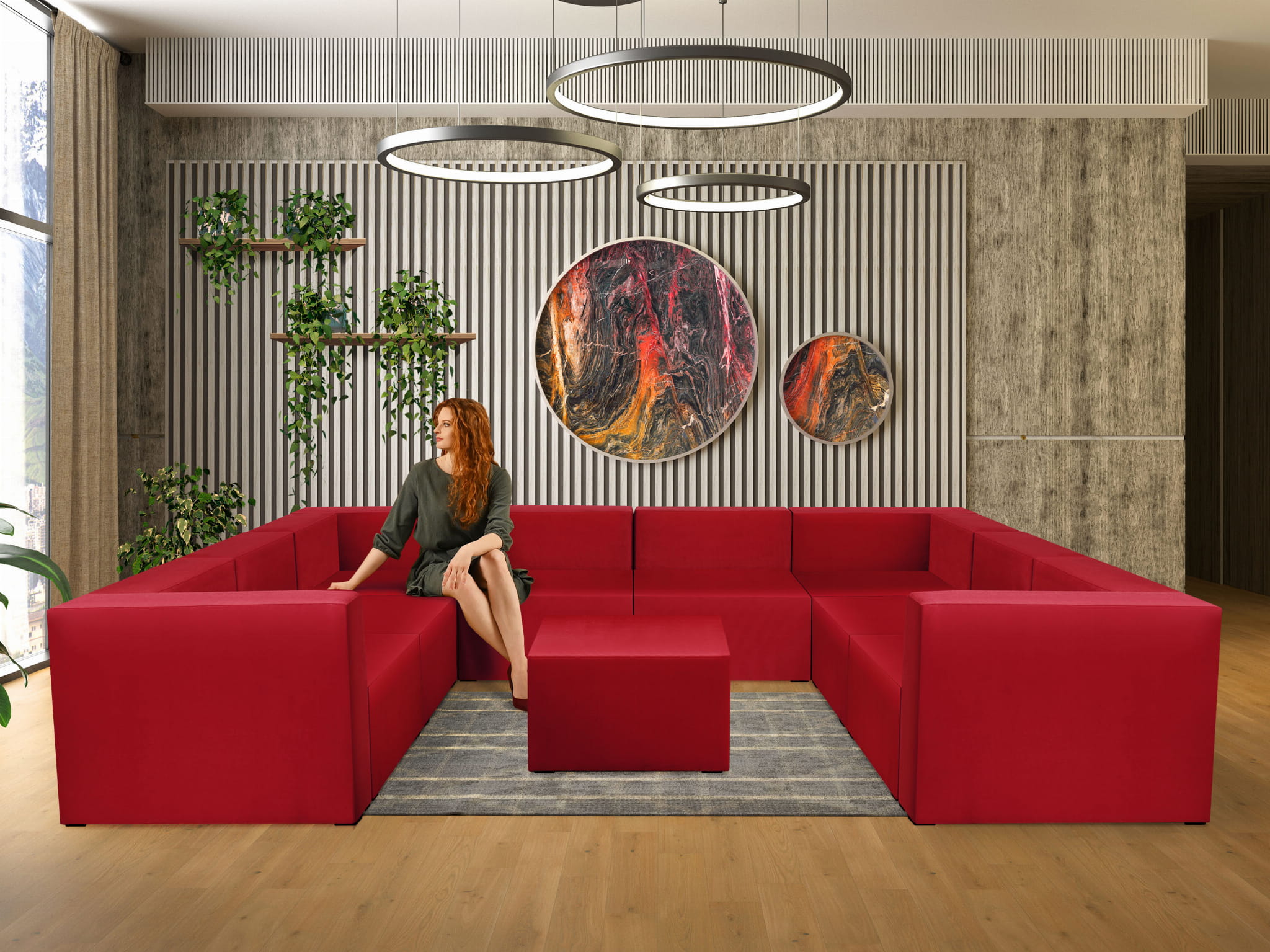 Sześcioosobowy narożnik modułowy w kształcie litery U z podnóżkiem w kolorze czerwonym LEON – element systemu modułowego samodzielny i do połączenia