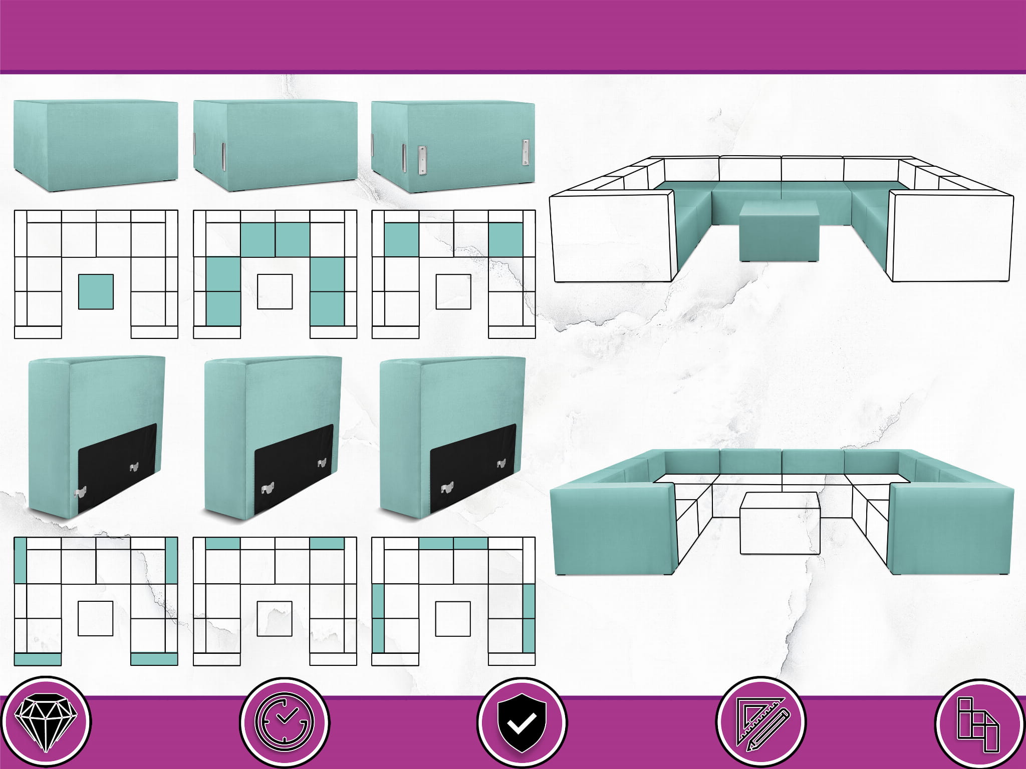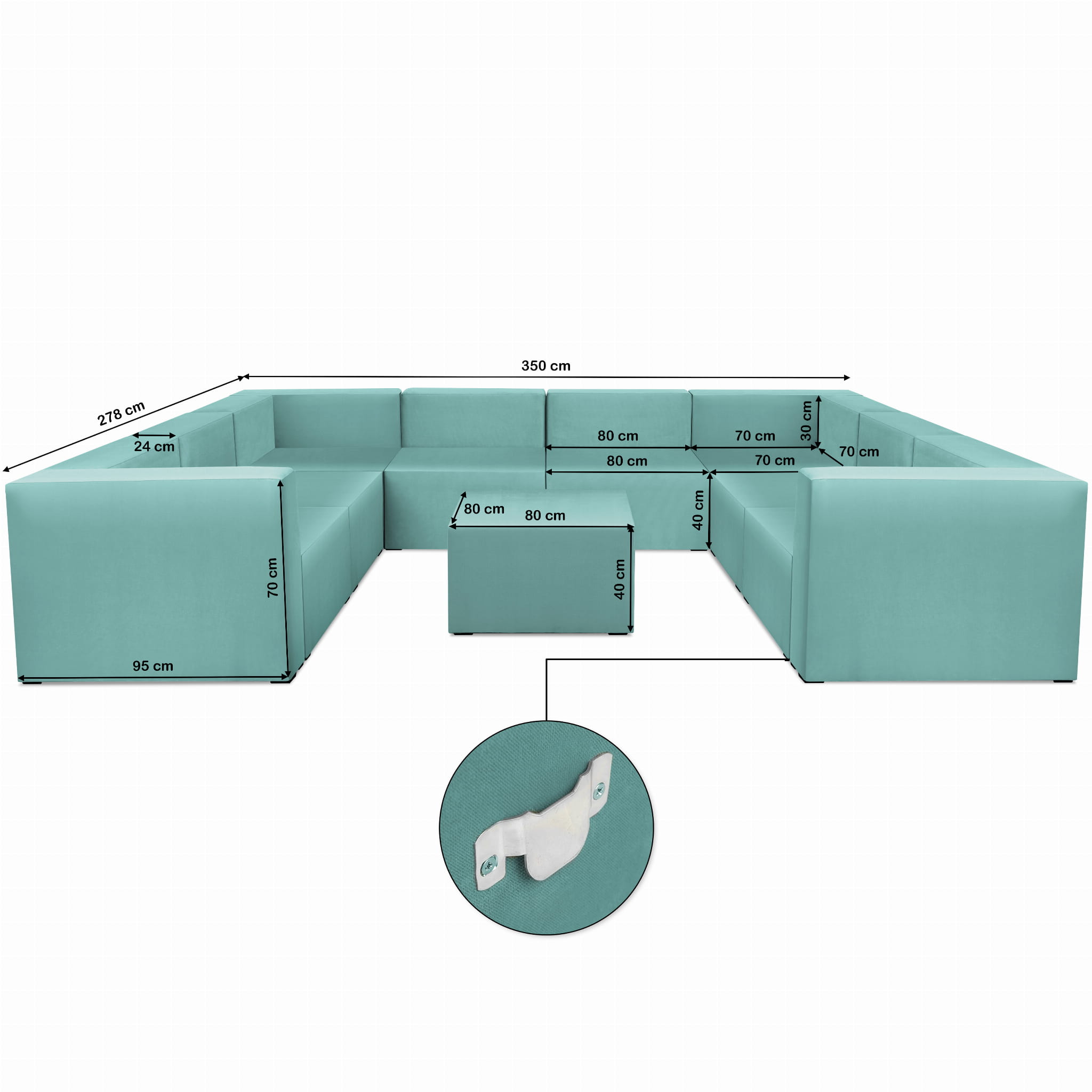 Narożnik modułowy w kształcie litery U z podnóżkiem 6-osobowy LEON w kolorze miętowym – segment do zestawu mebli modułowych: 9 siedzisk, 10 oparć, 2 podłokietniki