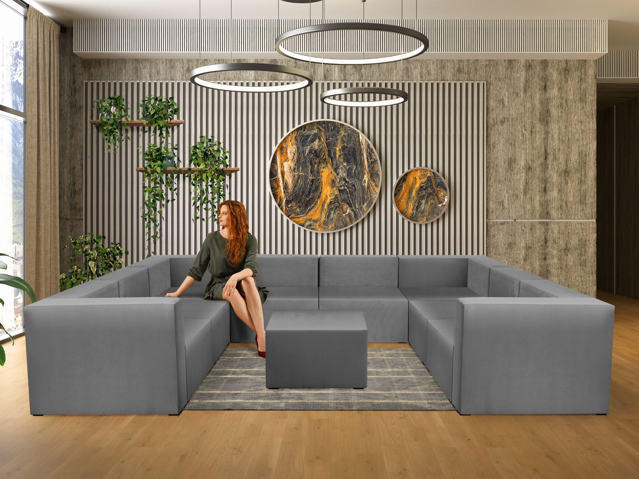 Narożnik modułowy w kształcie litery U z podnóżkiem 6-osobowy LEON w kolorze szarym – segment do zestawu mebli modułowych: 9 siedzisk, 10 oparć, 2 podłokietniki