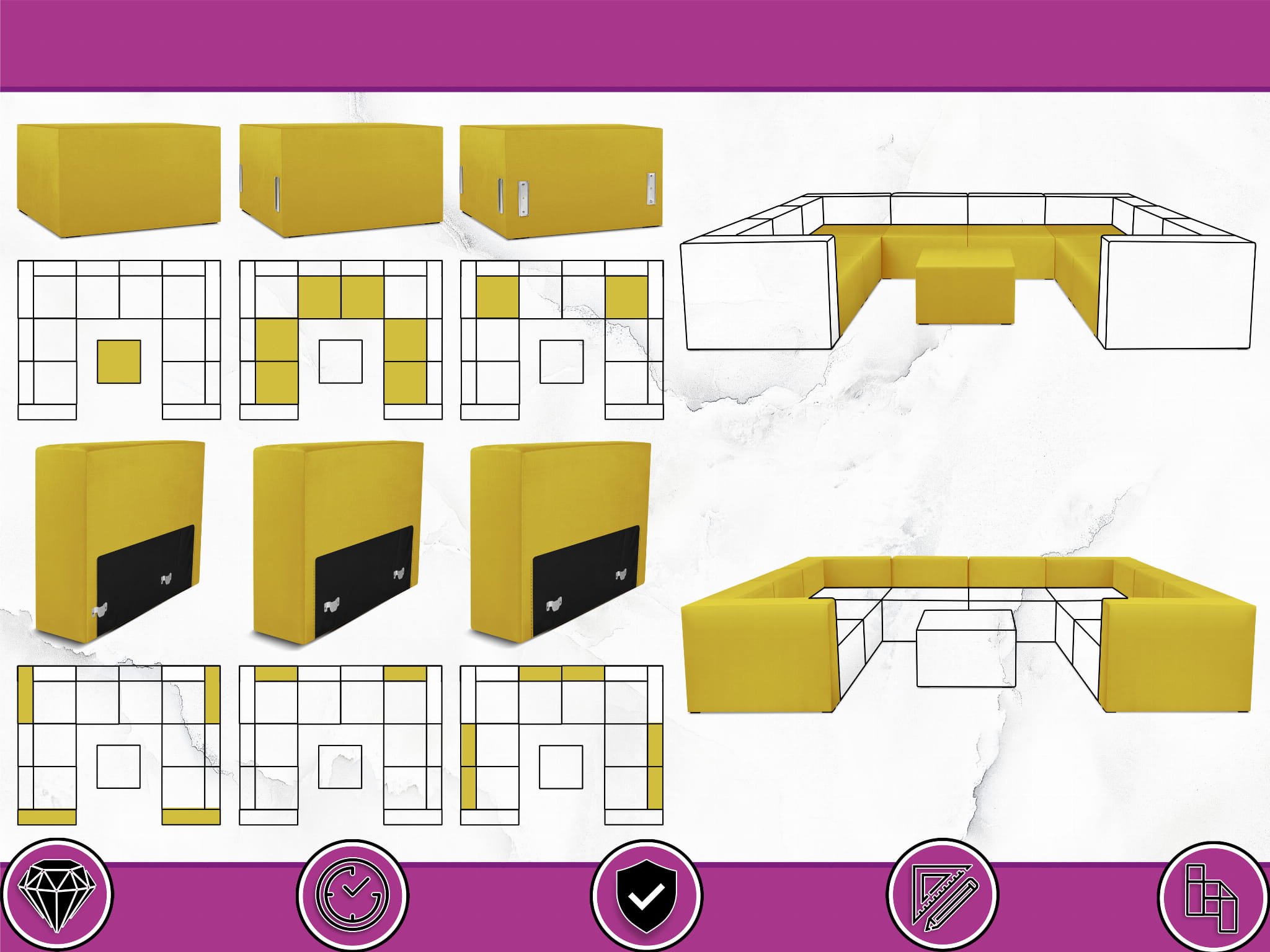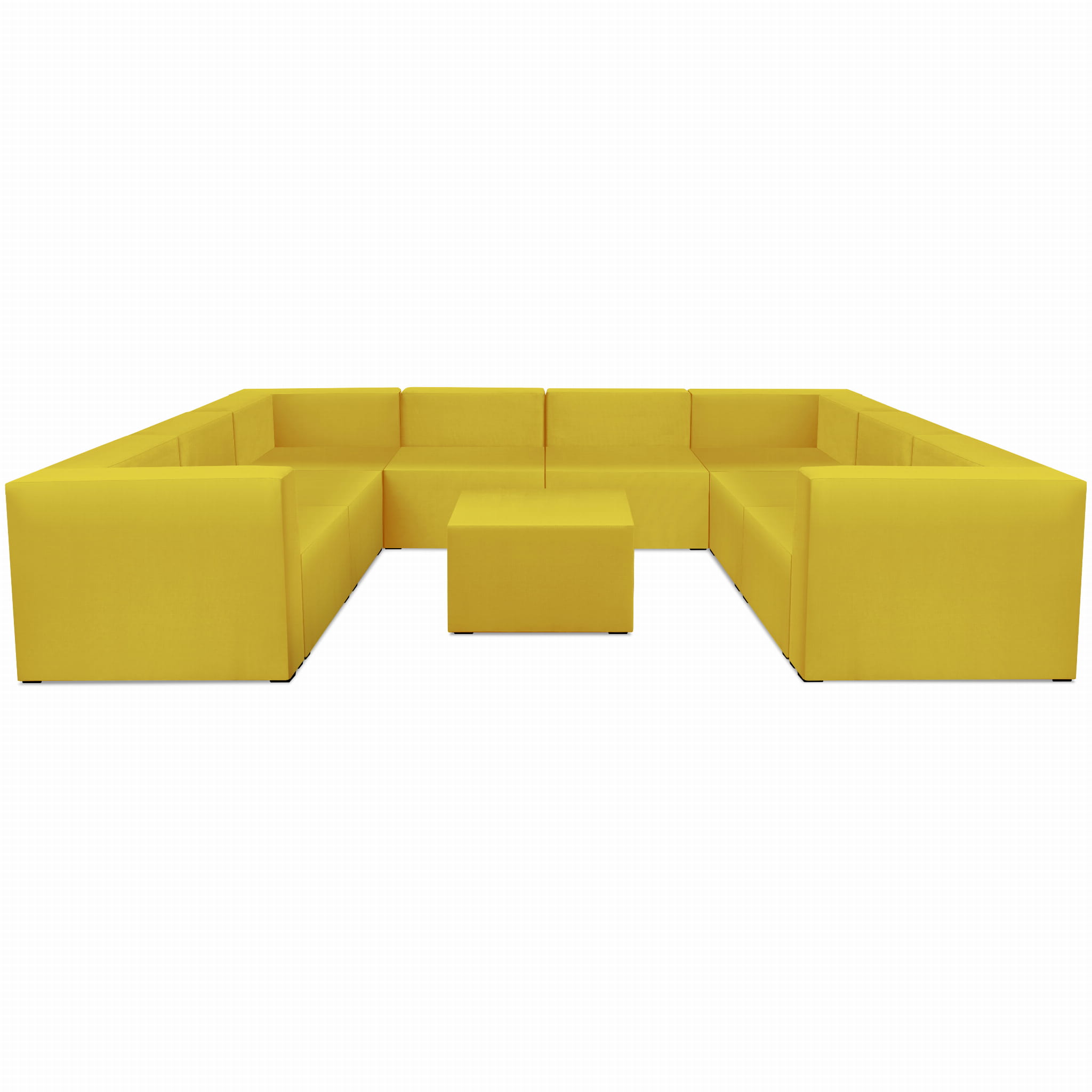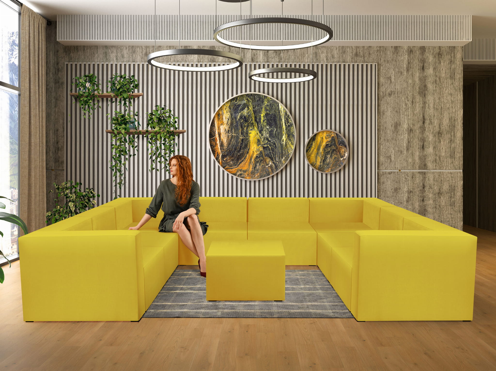 Sześcioosobowy narożnik modułowy w kształcie litery U z podnóżkiem w kolorze żółtym LEON – element systemu modułowego samodzielny i do połączenia