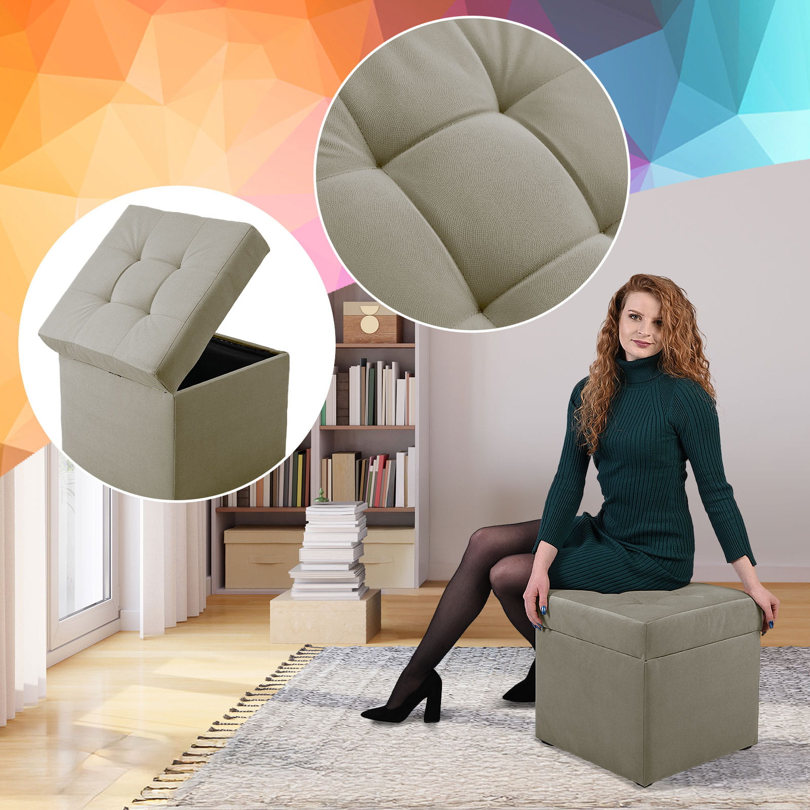 Nowoczesna otwierana pufa 45x45 w kolorze beżowym