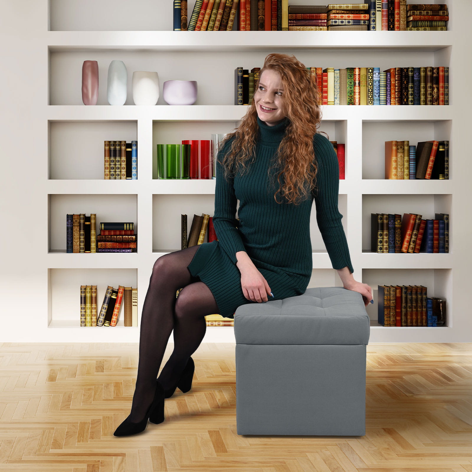 Nowoczesna otwierana pufa 45x45 w kolorze ciemnoszarym