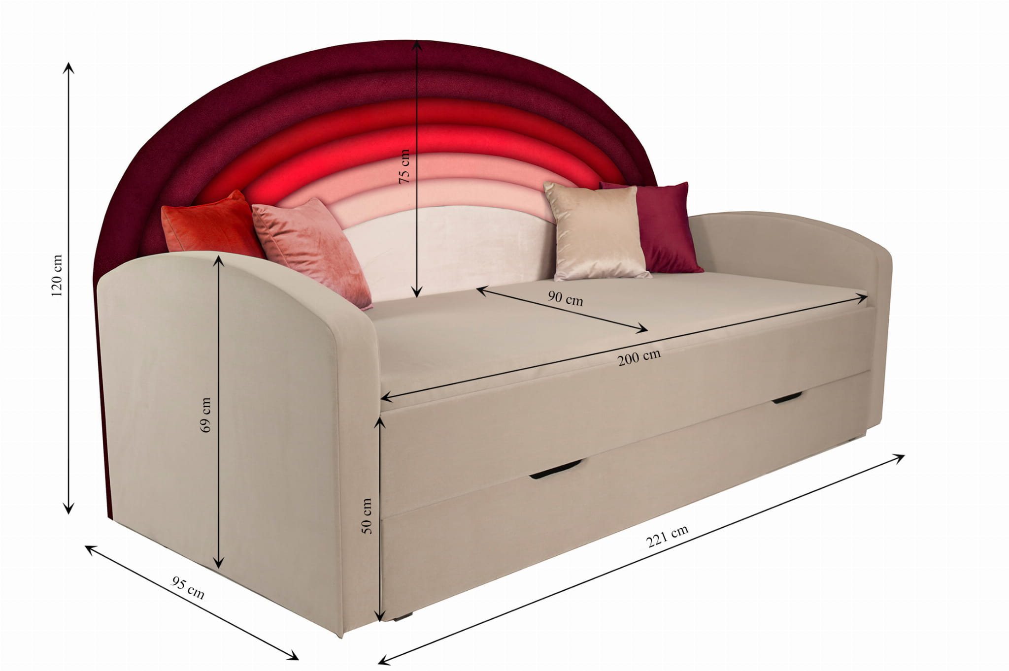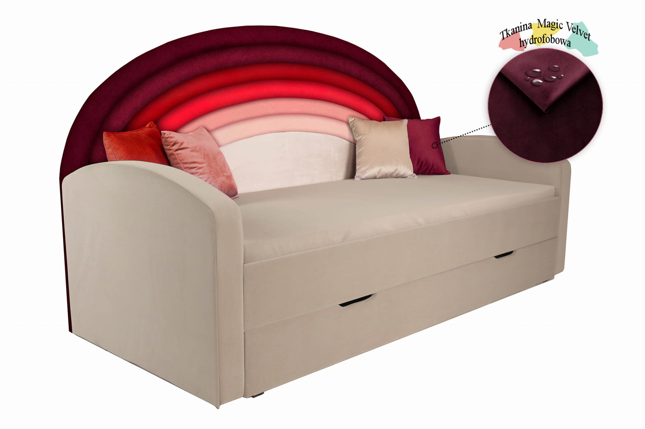 Elementem niewątpliwie wpływającym na wyjątkowość naszego łóżka Tęcza jest fakt, iż wyposażyliśmy je w niebanalne, wielokolorowe wezgłowie. Okaże się ono nie tylko oszałamiającym wizualnie elementem, ale również doskonałym oparciem.